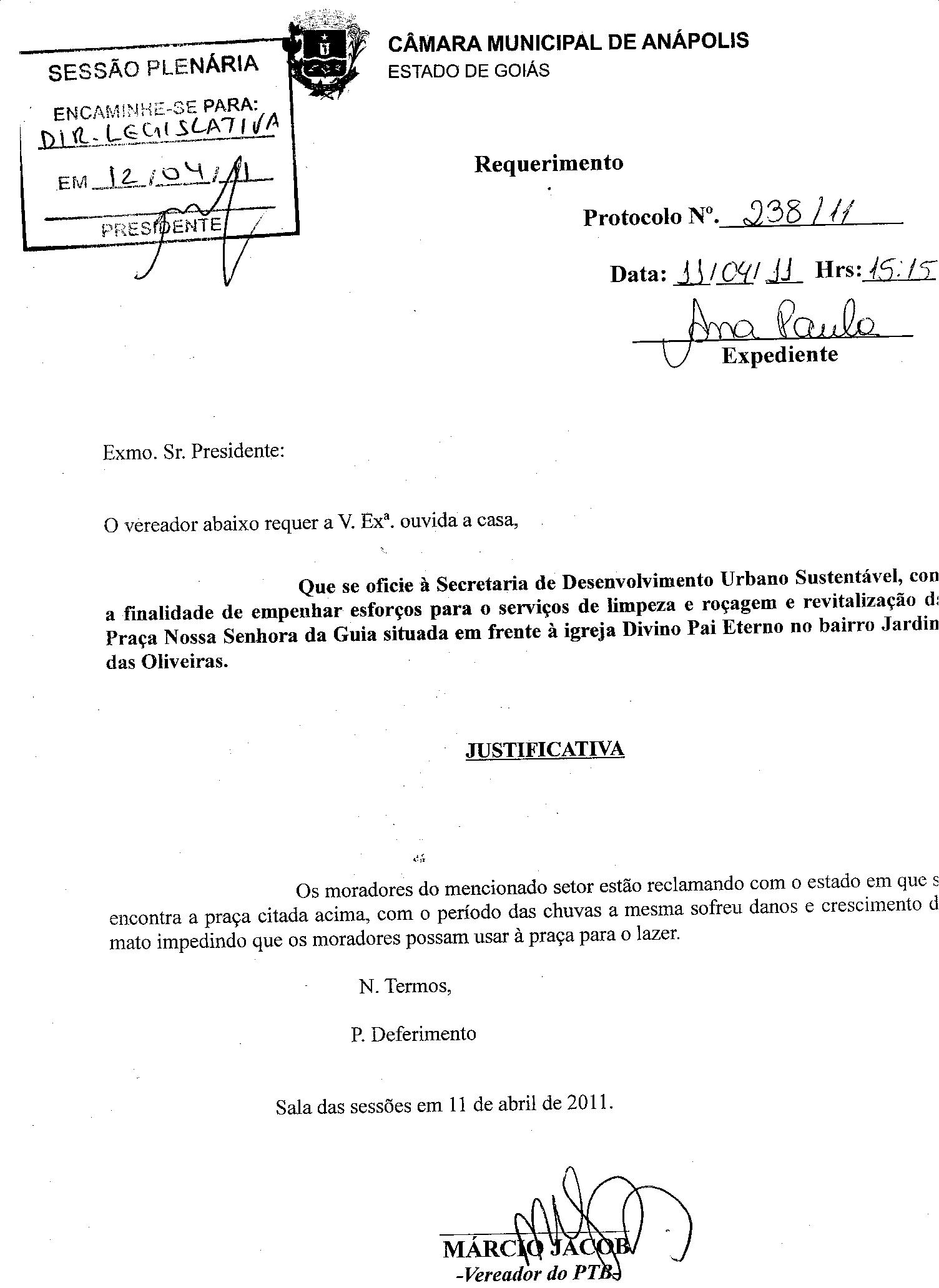 Ementa: O VEREADOR ABAIXO REQUER A V. EXª. OUVIDA A CASA, QUE SE OFÍCIE À SECRETÁRIA DE DESENVOLVIMENTO URBANO SUSTENTÁVEL, COM A FINALIDADE DE EMPENHAR ESFORÇOS PARA O SERVIÇOS DE LIMPEZA E ROÇAGEM E REVITALIZAÇÃO DA PRAÇA NOSSA SENHORA DA GUIA SITUADA EM FRENTE À IGREJA DIVINO PAI ETERNO NO BAIRRO JARDIM DAS OLIVEIRAS.