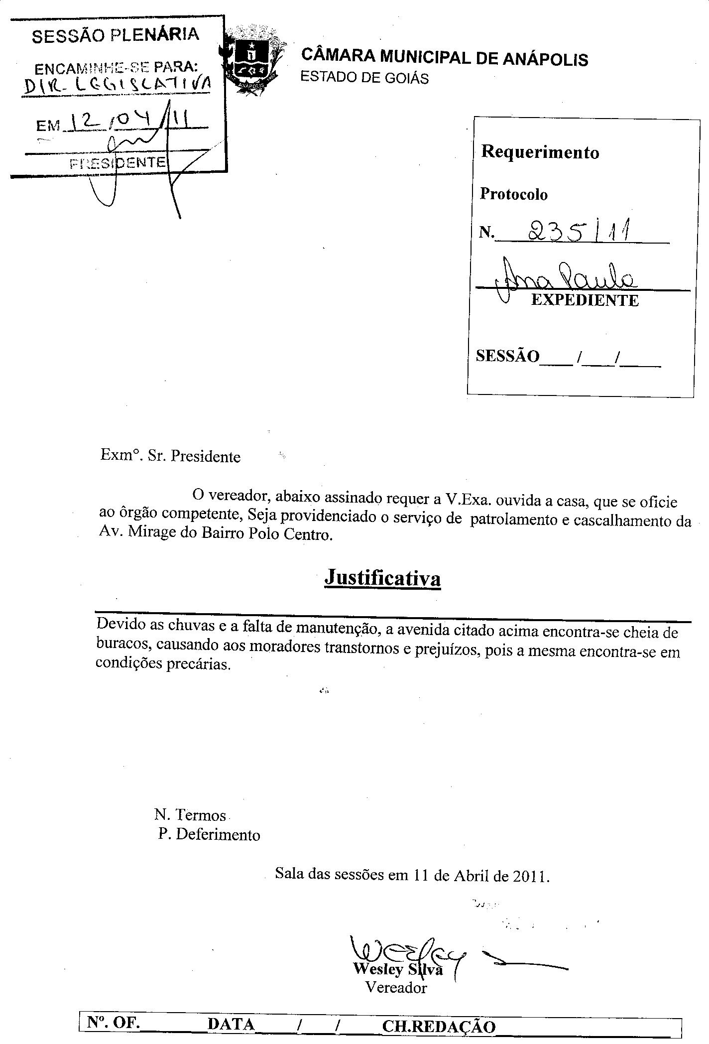 Ementa: O VEREADOR, ABAIXO ASSINADO REQUER A V.EXA. OUVIDA A CASA, QUE SE OFÍCIE AO ÓRGÃO COMPETENTE, SEJA PROVIDENCIADO O SERVIÇO DE PATROLAMENTO E CASCALHAMENTO DA AV. MIRAGE DO BAIRRO POLO CENTRO.