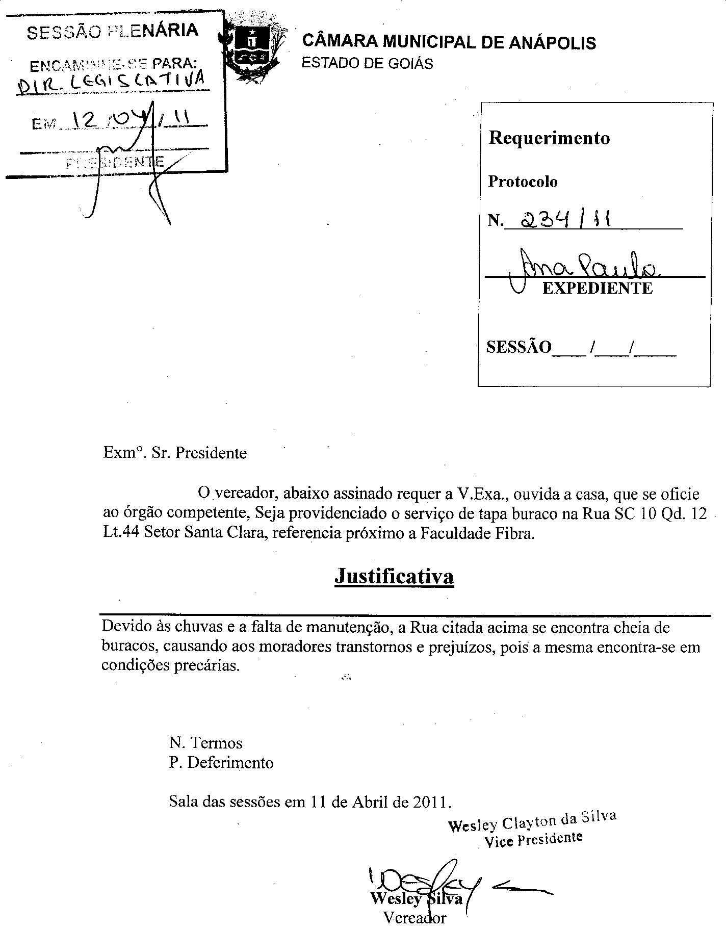 Ementa: O VEREADOR, ABAIXO ASSINADO REQUER A V.EXA., OUVIDA A CASA, QUE SE OFÍCIE AO ÓRGÃO COMPETENTE, SEJA PROVIDENCIADO O SERVIÇO DE TAPA BURACO NA RUA SC 10 QD.12 LT.44 SETOR SANTA CLARA, REFERENCIA PRÓXIMO A FACULDADE FIBRA.