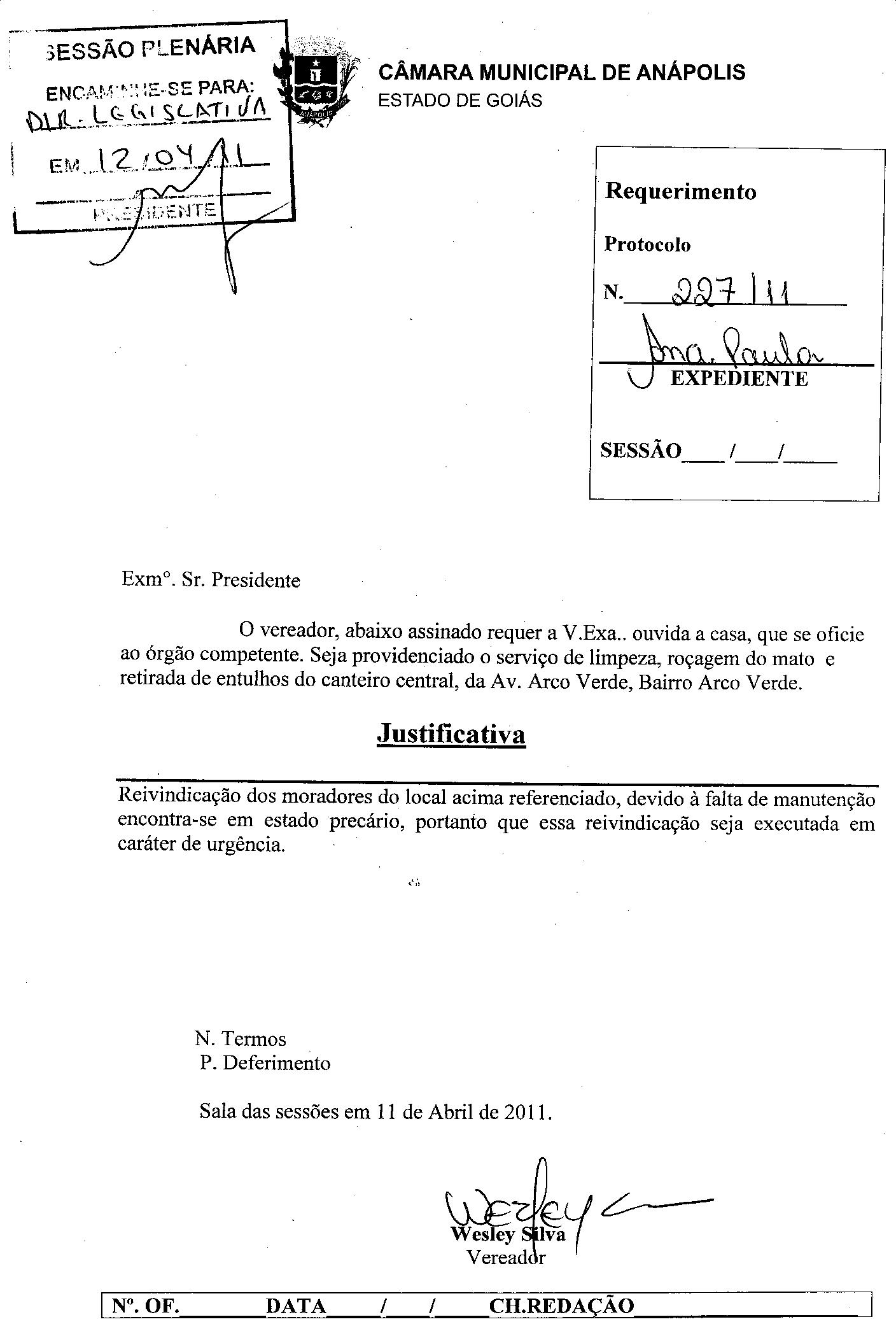 Ementa: O VEREADOR, ABAIXO ASSINADO REQUER A V.EXA., OUVIDA A CASA, QUE SE OFÍCIE AO ÓRGÃO COMPETENTE.SEJA PROVIDENCIADO O SERVIÇO DE LIMPEZA, ROÇAGEM DO MATO E RETIRADA DE ENTULHOS DO CANTEIRO CENTRAL, DA AV. ARCO VERDE,BAIRRO ARCO VERDE.