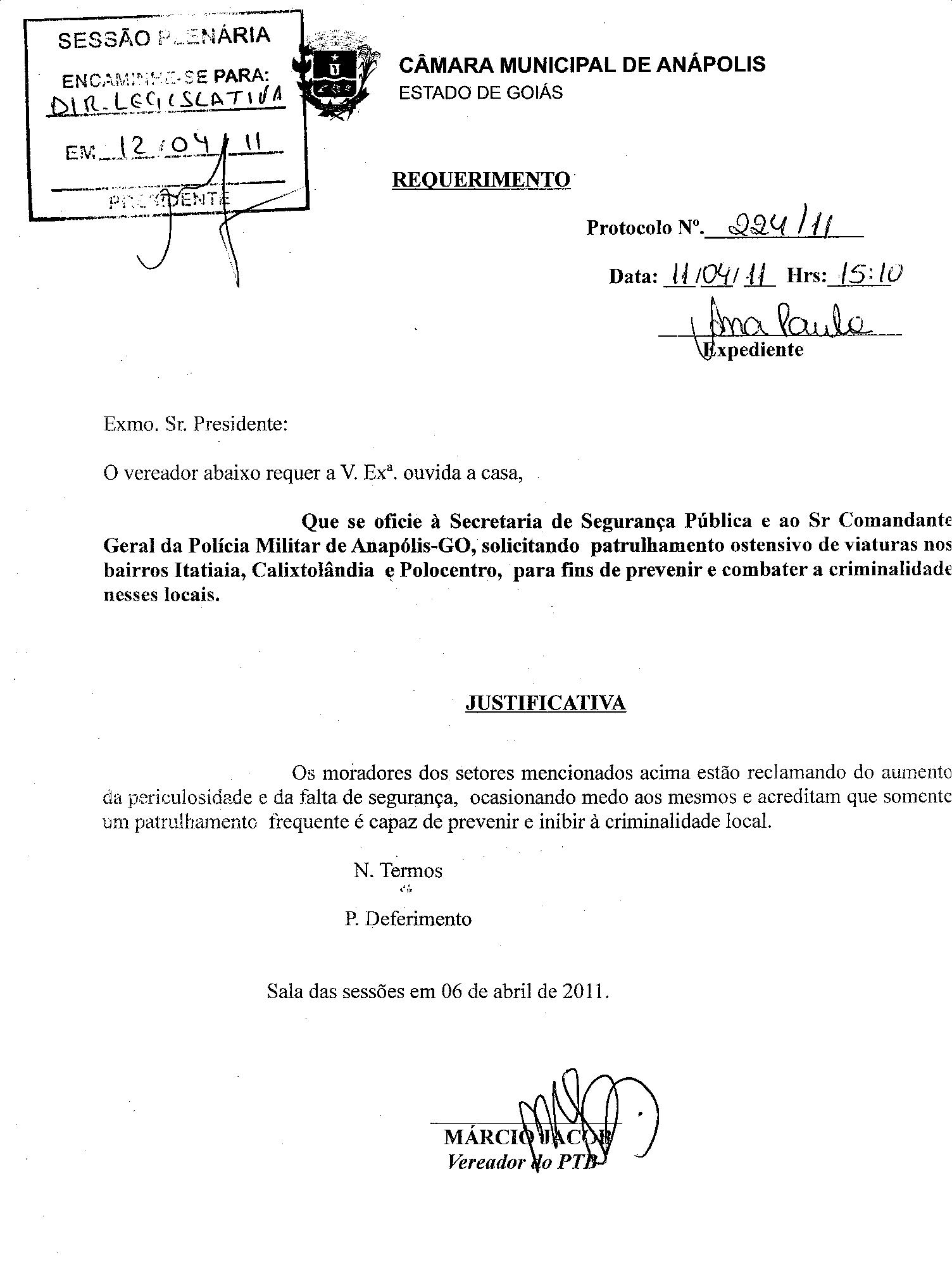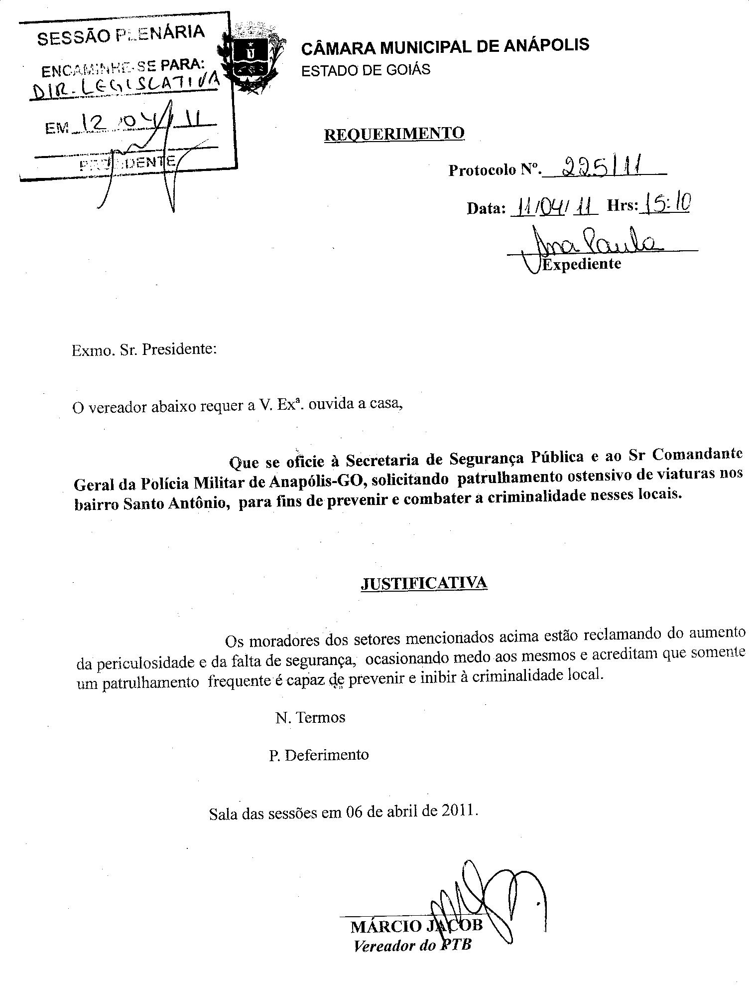 Ementa: O VEREADOR ABAIXO REQUER A V.EXª. OUVIDA A CASA,QUE SE OFICIE À SECRETARIA DE SEGURANÇA PÚBLICA E AO SR. COMANDANTE GERAL DA POLÍCIA MILITAR DE ANÁPOLIS-GO, SOLICITANDO PATRULHAMENTO OSTENSIVO DE VIATURAS NOS BAIRRO SANTO ANTÔNIO, PARA FINS DE PREVENIR E COMBATER A CRIMINALIDADE NESSES LOCAIS.