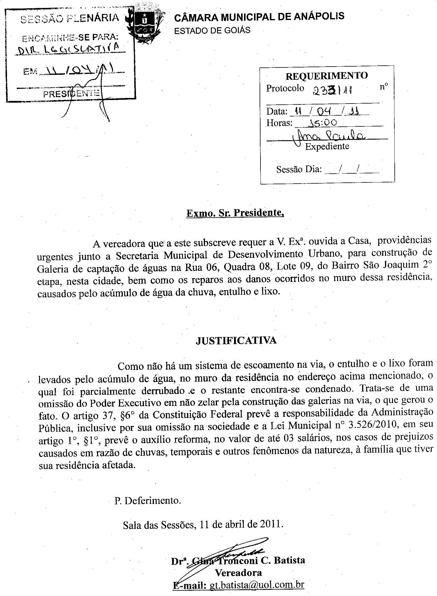 Ementa: A VEREADOR QUE A ESTE SUBSCREVE REQUER A V.EXª. OUVIDA A CASA, PROVIDÊNCIAS URGENTE JUNTO A SECRETARIA MUNICIPAL DE DESENVOLVIMENTO URBANO, PARA CONSTRUÇÃO DE GALERIA DE CAPTAÇÃO DE ÀGUAS NA RUA 06, QUADRA 08, LOTE 09, DO BAIRRO SÃO JOAQUIM 2ºETAPA, NESTA CIDADE, BEM COMO OS REPAROS AOS DANOS OCORRIDO NO MURO DESSA RESIDÊNCIA, CAUSADOS PELO ACÚMULO DE ÁGUA DA CHUVA, ENTULHO E LIXO.