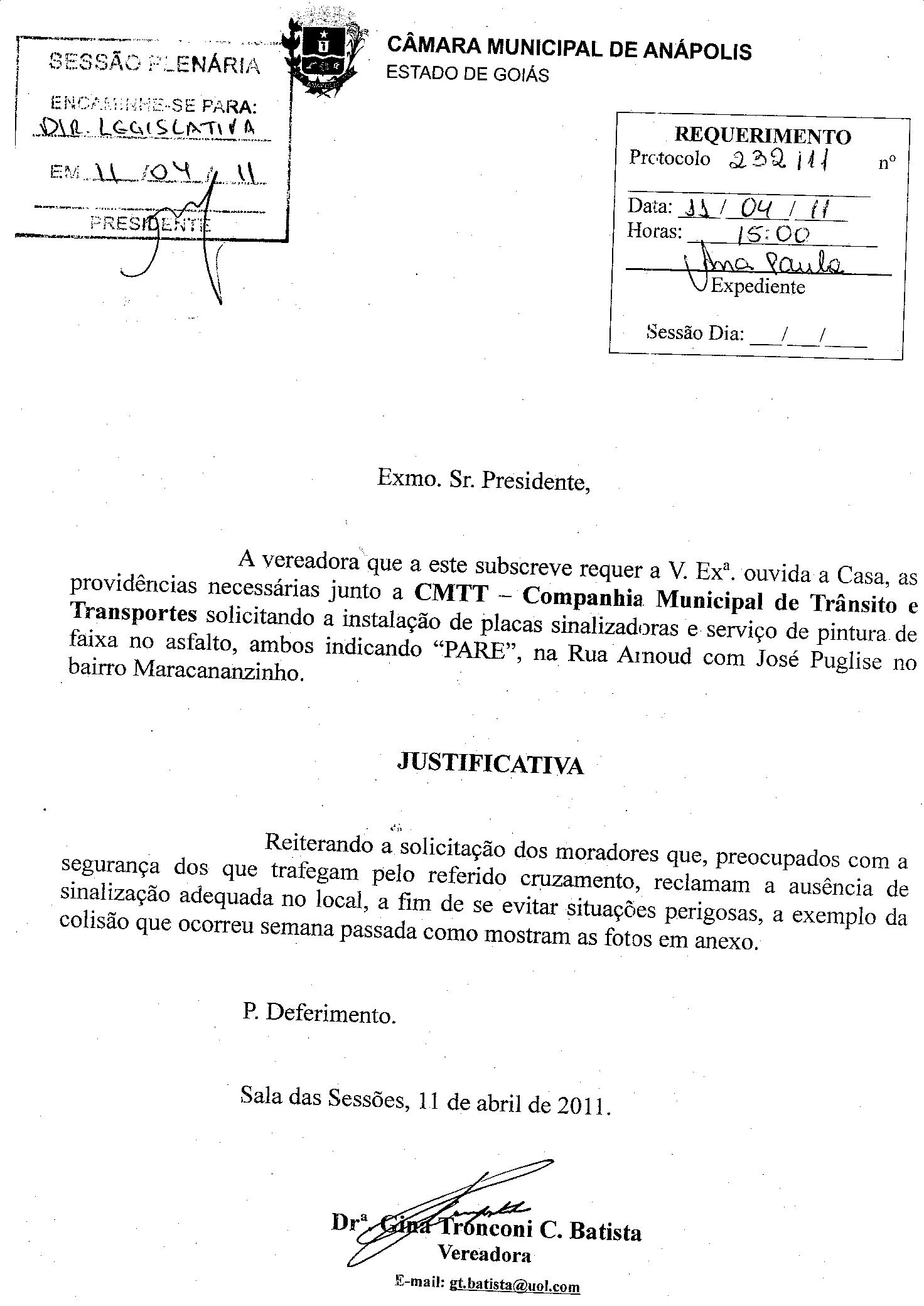 Ementa: A VEREADOR QUE A ESTE SUBSCREVE REQUER A V.EXª. OUVIDA A CASA, AS PROVIDÊNCIAS NECESSÁRIAS JUNTO A CMTT - COMPANHIA MUNICIPAL DE TRÂNSITO E TRANSPORTES SOLICITANDO A INSTALAÇÃO DE PLACAS SINALIZADORAS E SERVIÇO DE PINTURA DE FAIXA NO ASFALTO, AMBOS INDICANDO "PARE", NA RUA ARNOUD COM JOSÉ PUGLISE NO BAIRRO MARACANANZINHO.