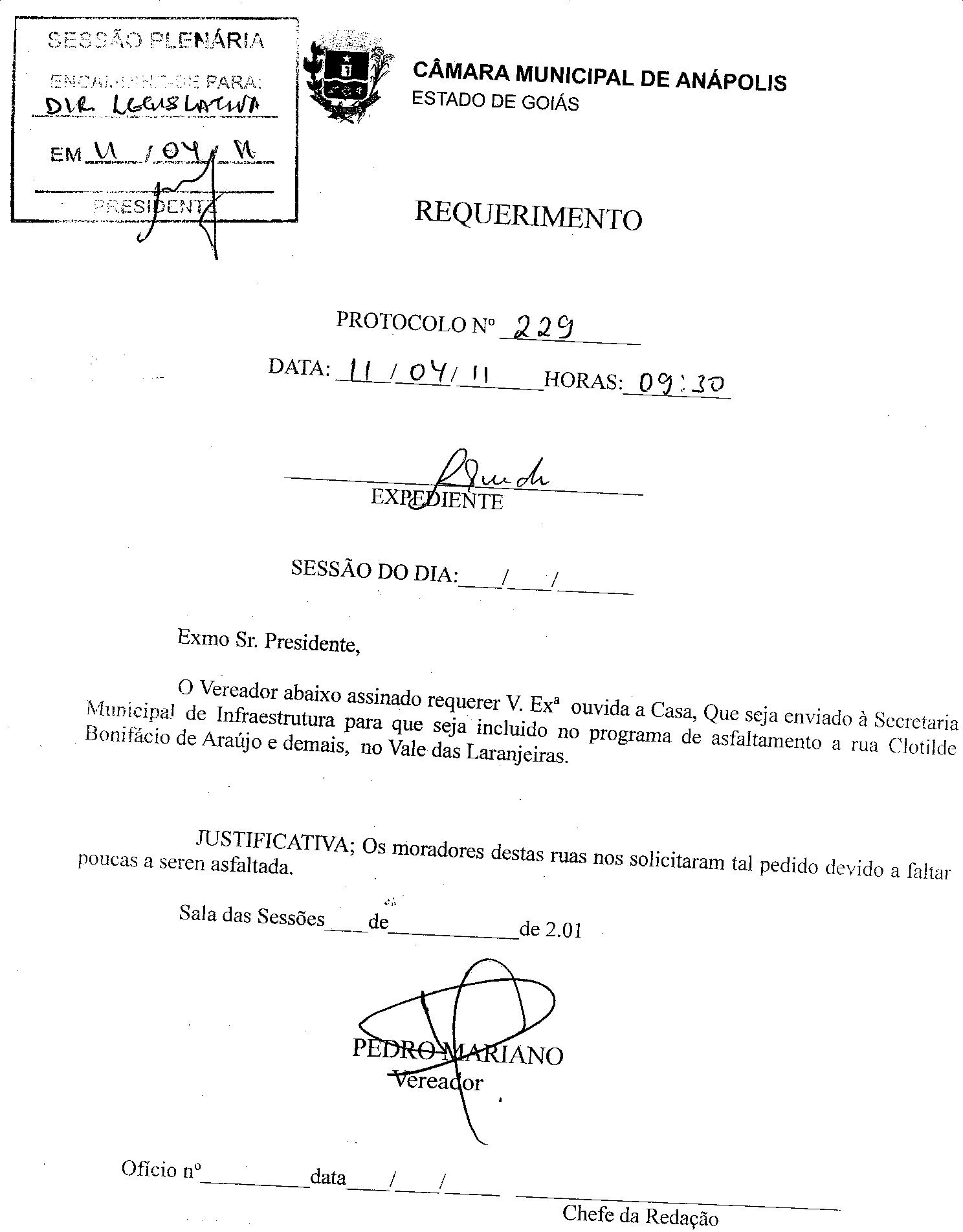Ementa: O VEREADOR ABAIXO ASSINADO REQUER V. EXª OUVIDA A CASA, QUE SEJA ENVIADO À SECRETARIA MUNICIPAL DE INFRAESTRUTURA PARA QUE SEJA INCLUÍDO NO PROGRAMA DE ASFALTAMENTO A RUA CLÓTILDE BONIFÁCIO DE ARAÚJO E DEMAIS, NO VALE DAS LARANJEIRAS.