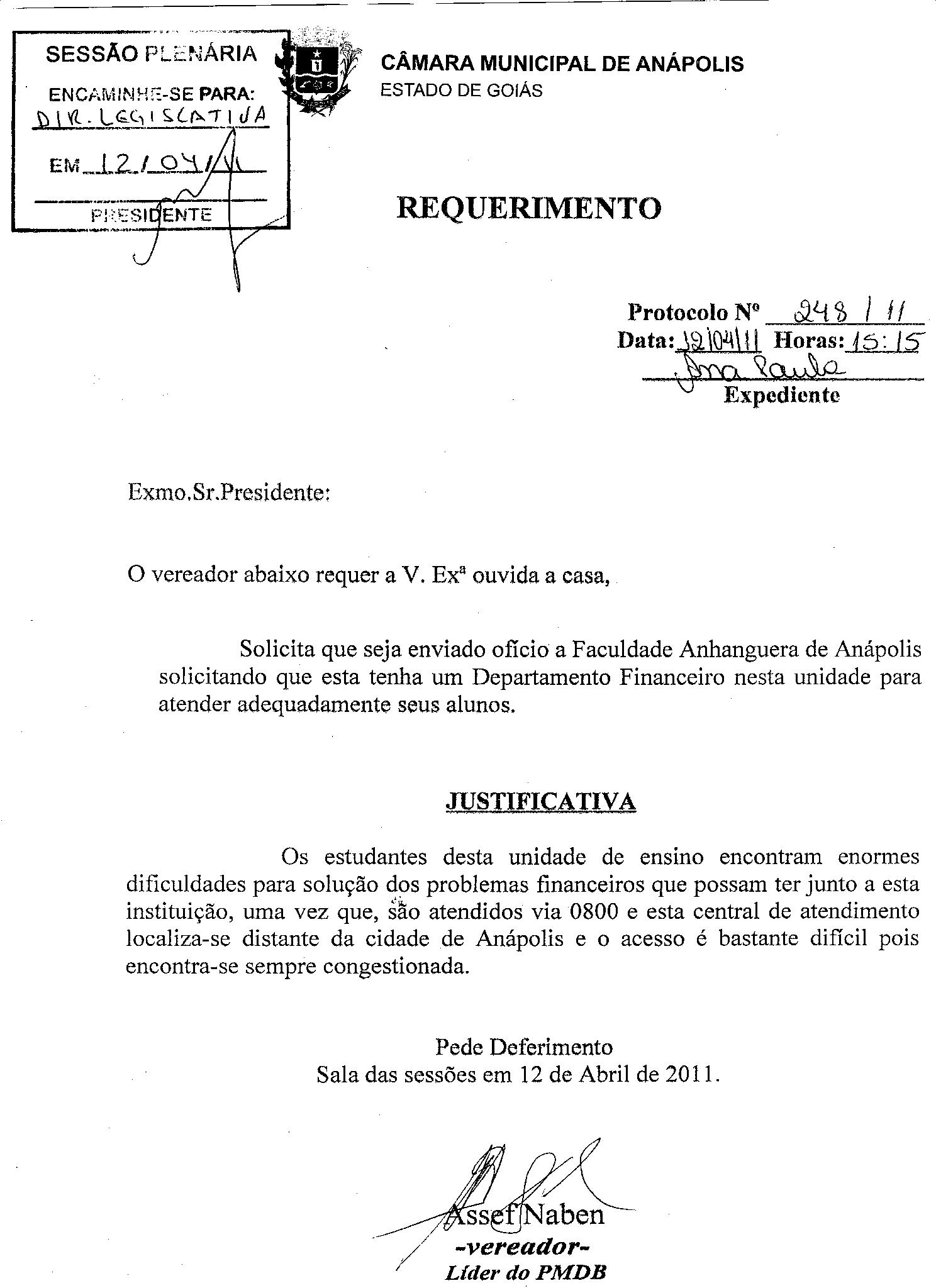 Ementa: O VEREADOR ABAIXO REQUER A V. EXª. OUVIDA A CASA, SOLICITA QUE SEJA ENVIADO OFÍCIO A FACULDADE ANHANGUERA DE ANÁPOLIS SOLICITANDO QUE ESTA TENHA UM DEPARTAMENTO FINANCEIRO NESTA UNIDADE PARA ATENDER ADEQUADAMENTE SEUS ALUNOS.