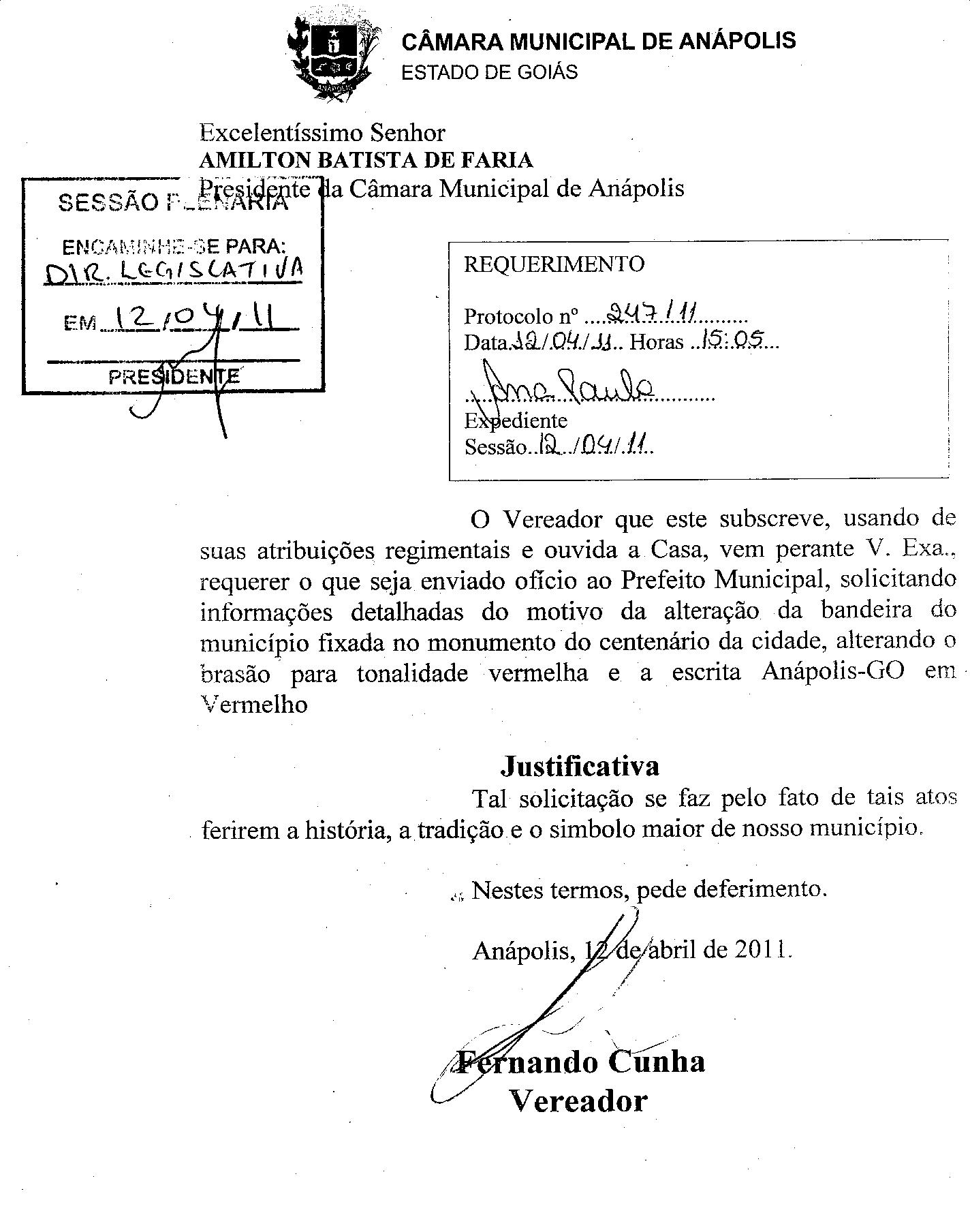 Ementa: O VEREADOR QUE ESTE SUBSCREVE, USANDO DE SUAS ATRIBUIÇÕES REGIMENTAIS E OUVIDA A CASA, VEM PERANTE V. EXA., REQUERER O QUE SEJA ENVIADO OFÍCIO AO PREFEITO MUNICIPAL, SOLICITANDO INFORMAÇÕES DETALHADAS DO MOTIVO DA ALTERAÇÃO DA BANDEIRA DO MUNICÍPIO FIXADA NO MONUMENTO DO CENTENÁRIO DA CIDADE, ALTERANDO O BRASÃO PARA TONALIDADE VERMELHA E A ESCRITA ANÁPOLIS-GO EM VERMELHO.