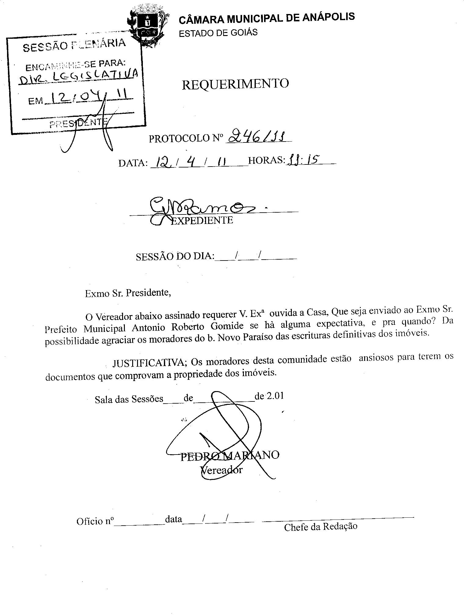 Ementa: O VEREADOR ABAIXO ASSINADO REQUERER V.EXª. OUVIDA A CASA, QUE SEJA ENVIADO AO EXMO SR.PREFEITO MUNICIPAL ANTONIO ROBERTO GOMIDE SE HÁ ALGUMA EXPECTATIVA, E PRA QUANDO? DA POSSIBILIDADE AGRACIAR OS MORADORES DO B. NOVO PARAÍSO DAS ESCRITURAS DEFINITIVAS DOS IMÓVEIS.