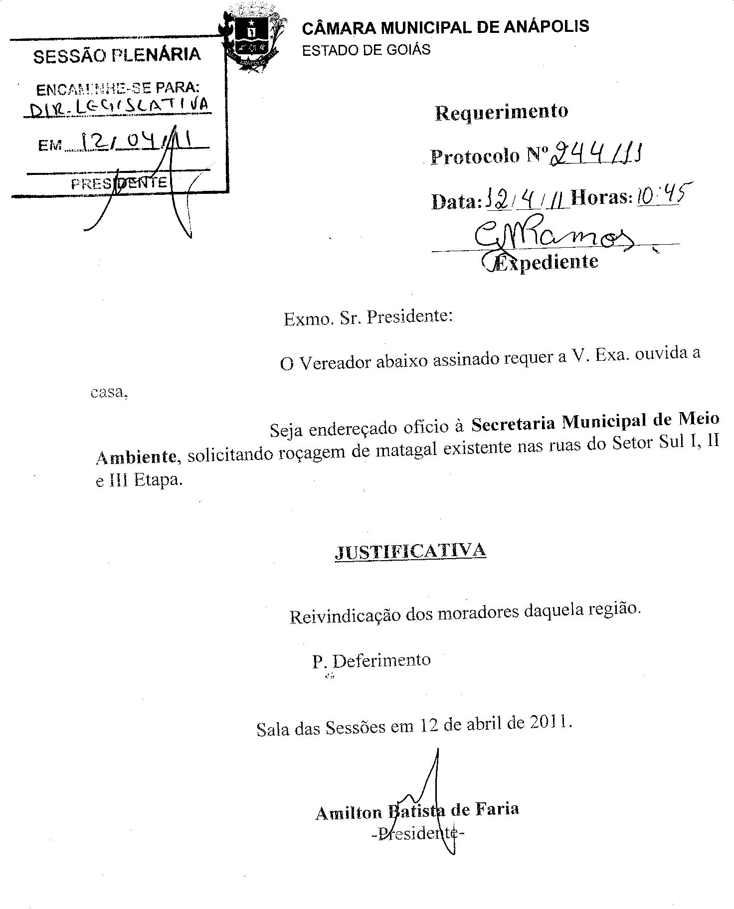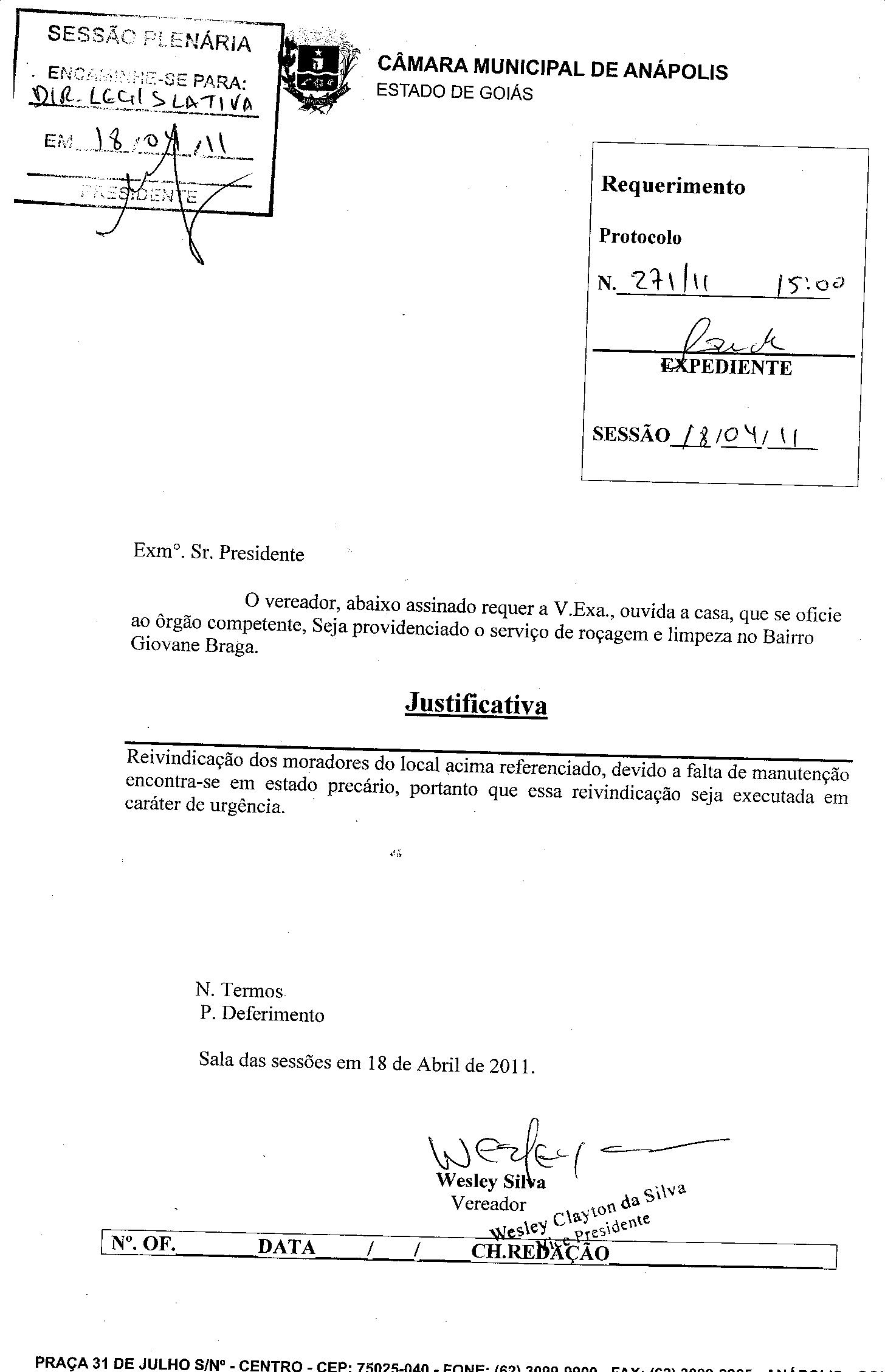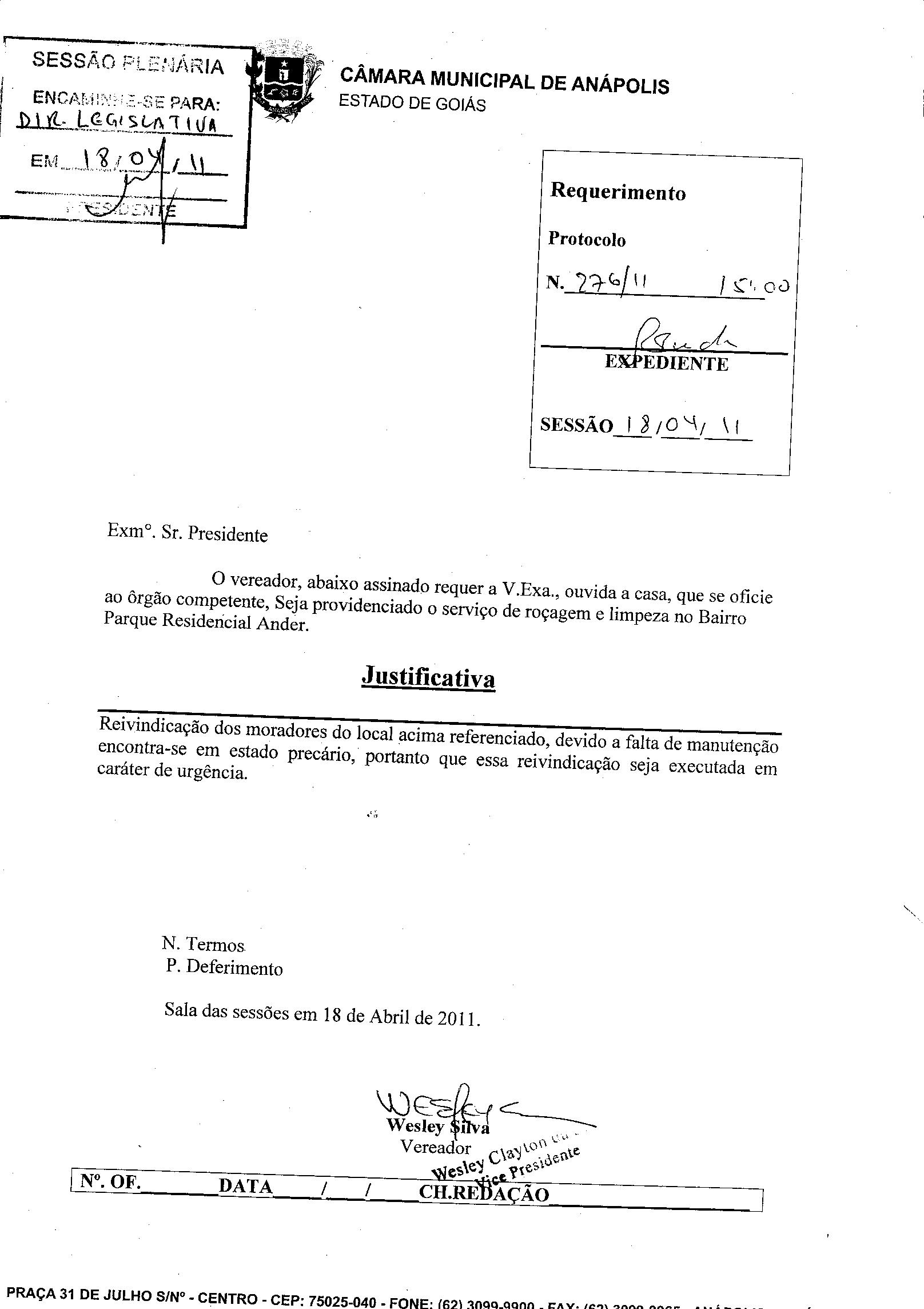Ementa: O VEREADOR , ABAIXO ASSINADO REQUER A V.EXA., OUVIDA A CASA, QUE SE OFÍCIE AO ÓRGÃO COMPETENTE,SEJA PROVIDENCIADO O SERVIÇO DE ROÇAGEM E LIMPEZA NO BAIRRO PARQUE RESIDENCIAL ANDER.