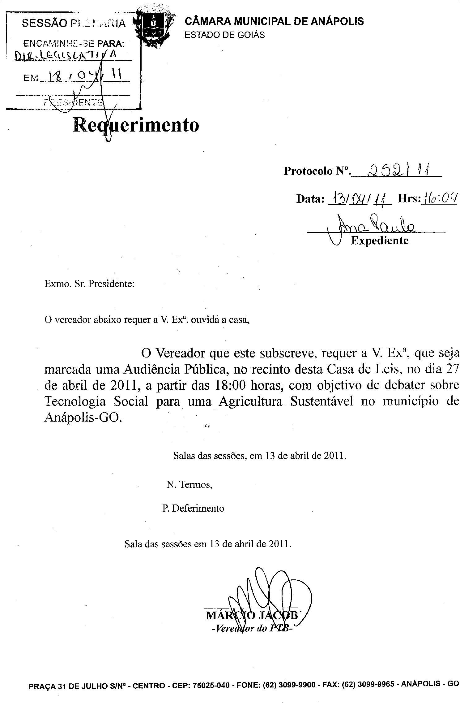 Ementa: O VEREADOR ABAIXO REQUER A V.EXª. OUVIDA A CASA, O VEREADOR QUE ESTE SUBSCREVE, REQUER A V.EXª, QUE SEJA MARCADA UMA AUDIÊNCIA PÚBLICA, NO RECINTO DESTA CASA DE LEIS, NO DIA 27 DE ABRI DE 2011, A PARTIR DAS 18:00 HORAS, COM OBJETIVO DE DEBATER SOBRE TECNOLOGIA SOCIAL PARA UMA AGRICULTURA SUSTENTÁVEL NO MUNICÍPIO DE ANÁPOLIS-GO.