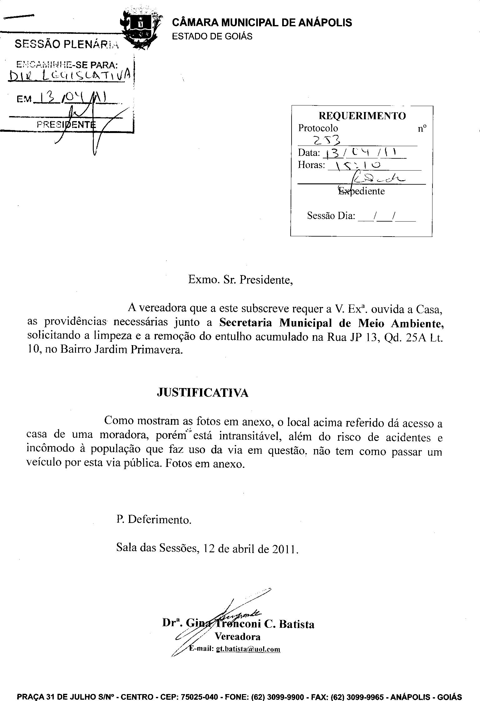 Ementa: A VEREADORA QUE A ESTE SUBSCREVE REQUER A V. EXª. OUVIDA A CASA, AS PROVIDÊNCIAS NECESSÁRIAS JUNTO A SECRETARIA MUNICIPAL DE MEIO AMBIENTE, SOLICITANDO A LIMPEZA E A REMOÇÃO DO ENTULHO ACUMULADO NA RUA JP 13, QD.25 A LT. 10, NO BAIRRO JARDIM PRIMAVERA.