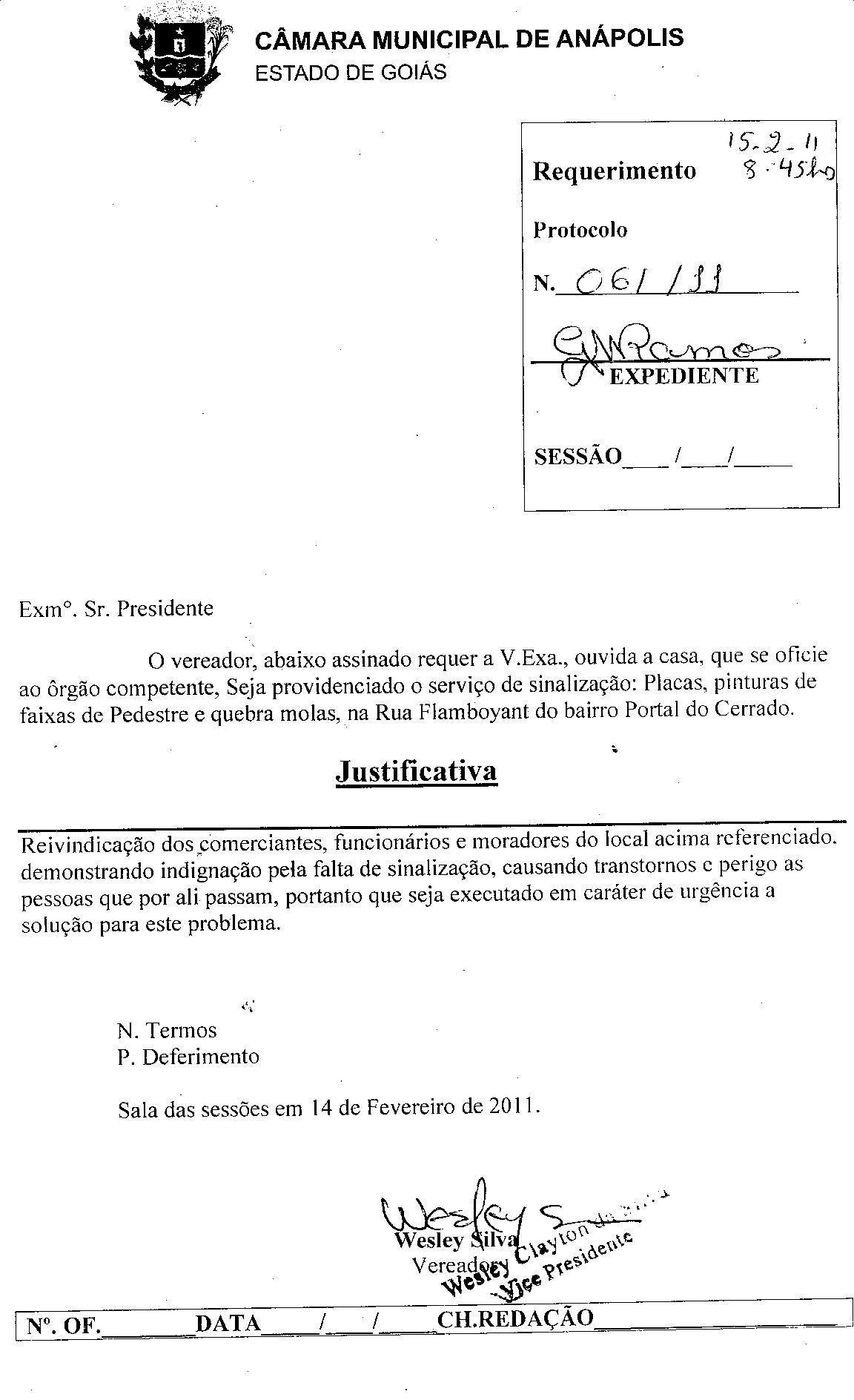 Ementa: O VEREADOR, ABAIXO ASSINADO REQUER A V.EXA., OUVIDA A CASA, QUE SE OFÍCIE AO ÓRGÃO COMPETENTE, SEJA PROVIDENCIADO O SERVIÇO DE SINALIZAÇÃO REDUTOR DE VELOCIDADE: QUEBRA MOLAS OU BARREIRAS ELETRÔNICAS NA AV. 01 ALTURA DA QD 03 LT.03 ESQUINA COM A NAIR XAVIER, ATRÁS DA VILA DOS OFICIAIS, NO BAIRRO ANTÔNIO FERNANDES.
