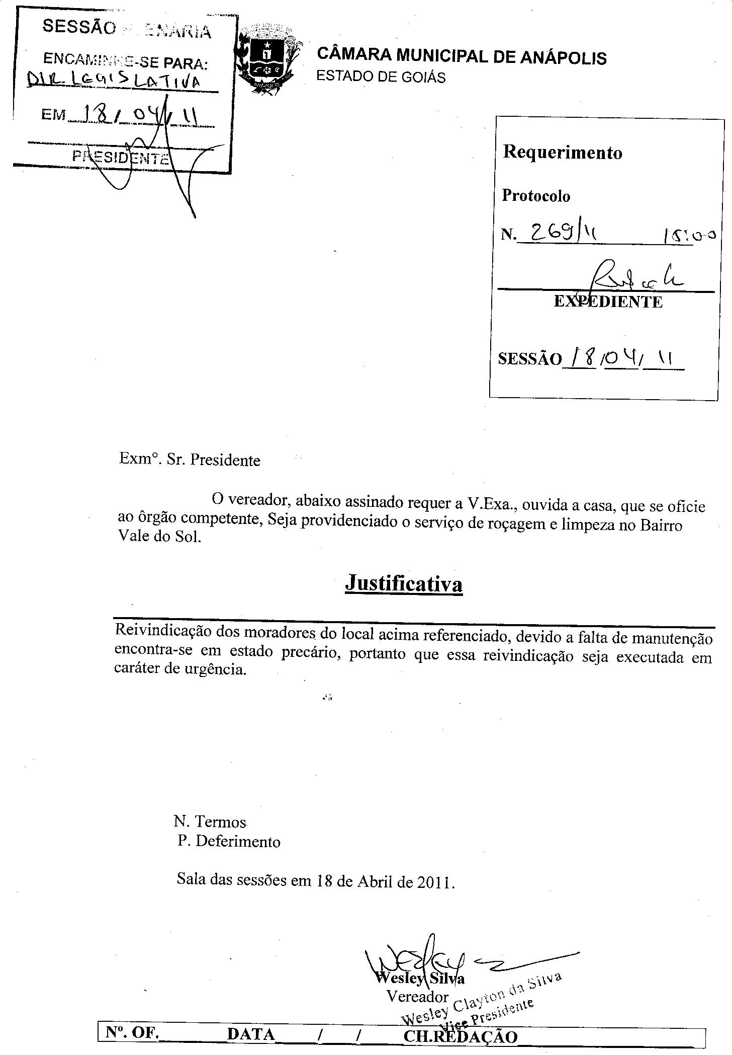 Ementa: O VEREADOR, ABAIXO ASSINADO REQUER A V.EXA., OUVIDA A CASA, QUE SE OFÍCIE AO ÓRGÃO COMPETENTE, SEJA PROVIDENCIADO O SERVIÇO DE ROÇAGEM E LIMPEZA NO BAIRRO VALE DO SOL.