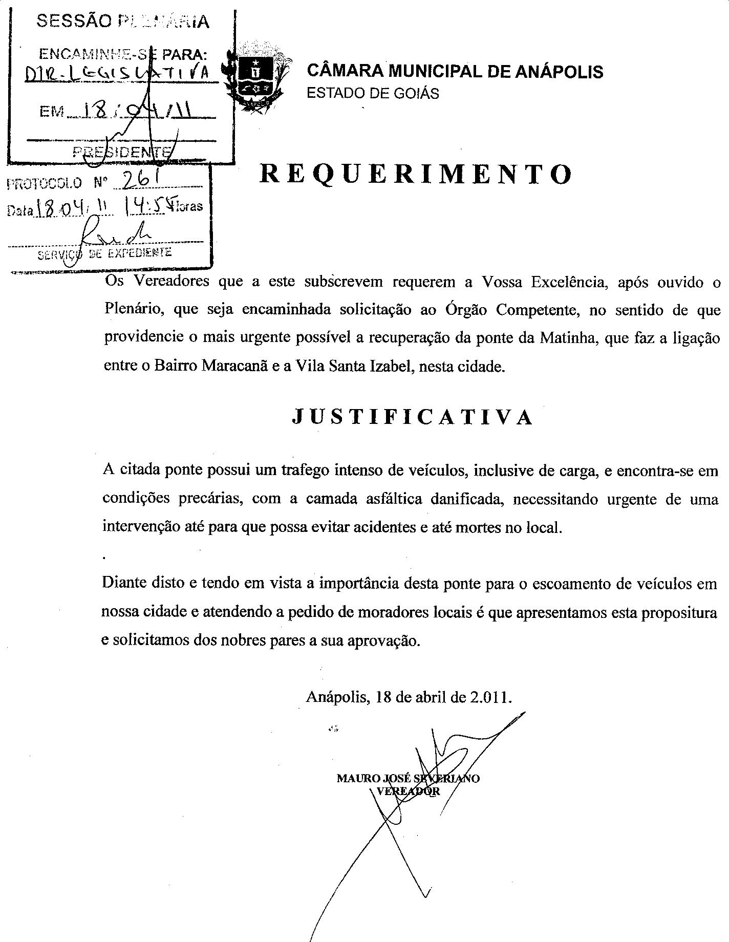 Ementa: OS VEREADORES QUE A ESTE SUBSCREVEM REQUEREM A VOSSA EXCELÊNCIA, APÓS OUVIDO O PLENÁRIO, QUE SEJA ENCAMINHADA SOLICITAÇÃO AO ÒRGÃO COMPETENTE, NO SENTIDO DE QUE PROVIDENCIE O MAIS URGENTE POSSÍVEL A RECUPERAÇÃO DA PONTE DA MATINHA, QUE FAZ A LIGAÇÃO ENTRE O BAIRRO MARACANÃ E A VILA SANTA IZABEL, NESTA CIDADE.