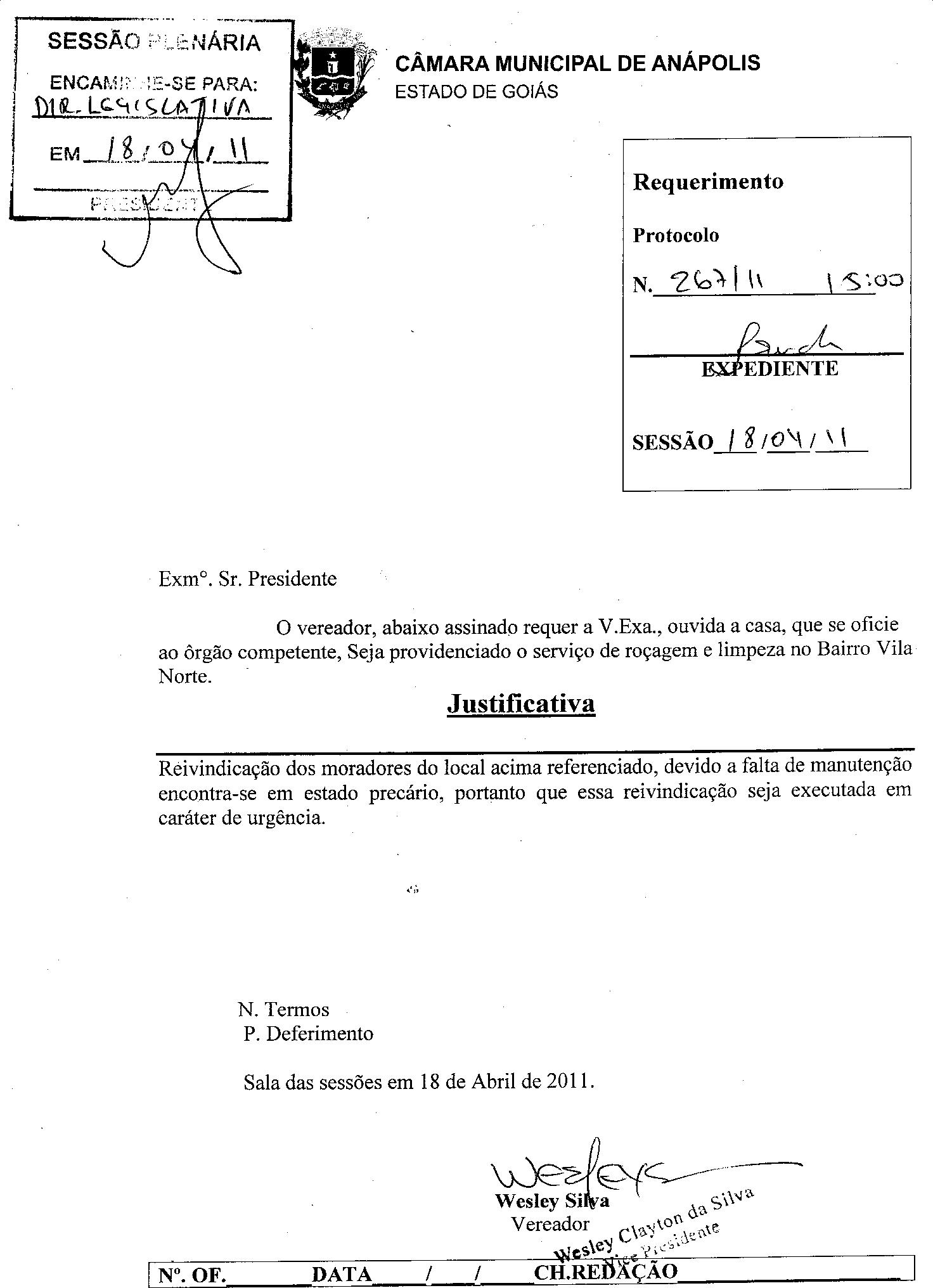 Ementa: O VEREADOR, ABAIXO ASSINADO REQUER A V.EXA., OUVIDA A CASA, QUE SE OFÍCIE AO ÓRGÃO COMPETENTE, SEJA PROVIDENCIADO O SERVIÇO DE ROÇAGEM E LIMPEZA NO BAIRRO VILA NORTE.