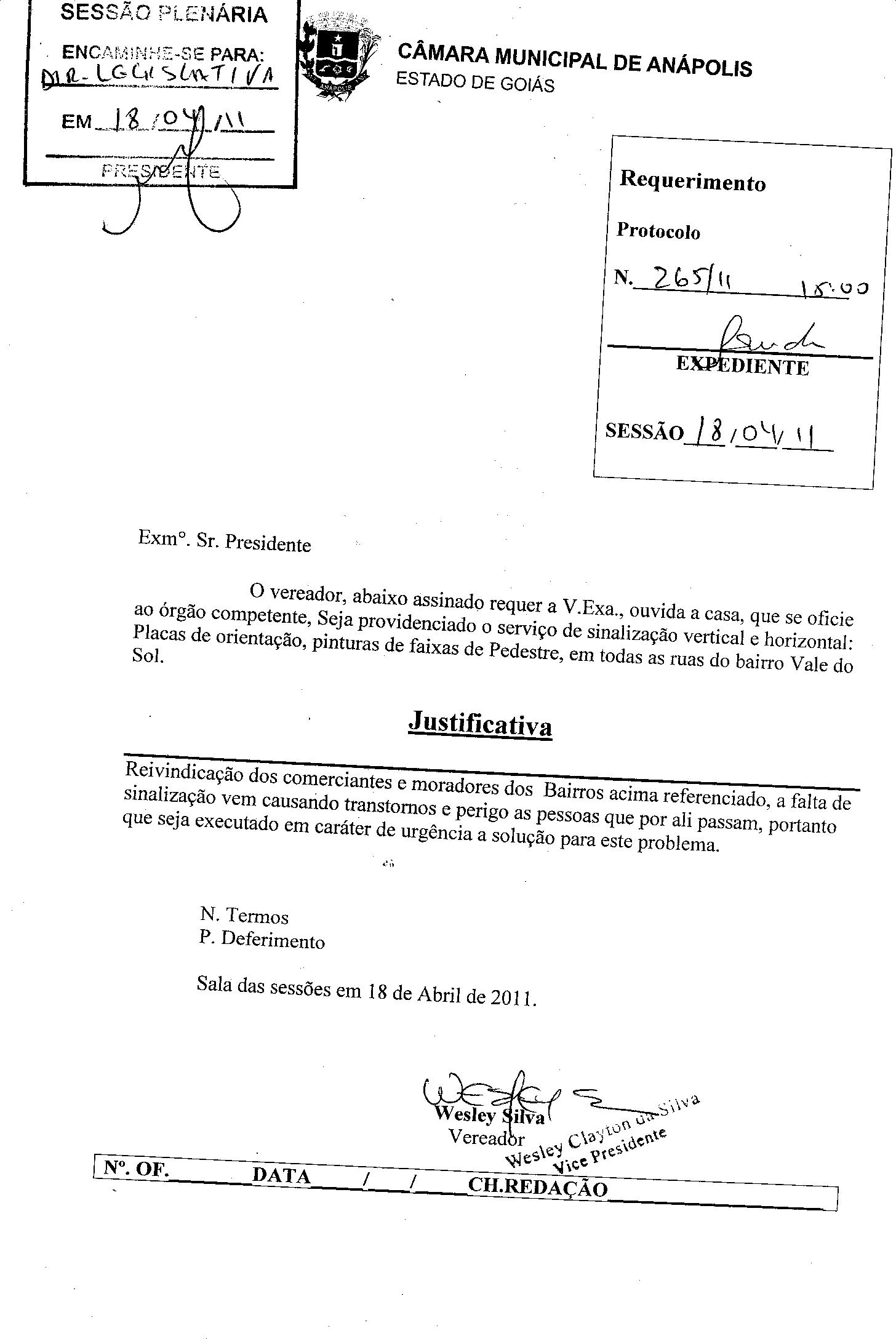 Ementa: O VEREADOR, ABAIXO ASSINANDO REQUER A V.EXA., OUVIDA A CASA, QUE SE OFÍCIE AO ÓRGÃO COMPETENTE, SEJA PROVIDENCIADO O SERVIÇO DE SINALIZAÇÃO VERTICAL HORIZONTAL: PLACAS DE ORIENTAÇÃO, PINTURAS FAIXAS DE PEDESTRE, EM TODAS AS RUAS DO BAIRRO VALE DO SOL.