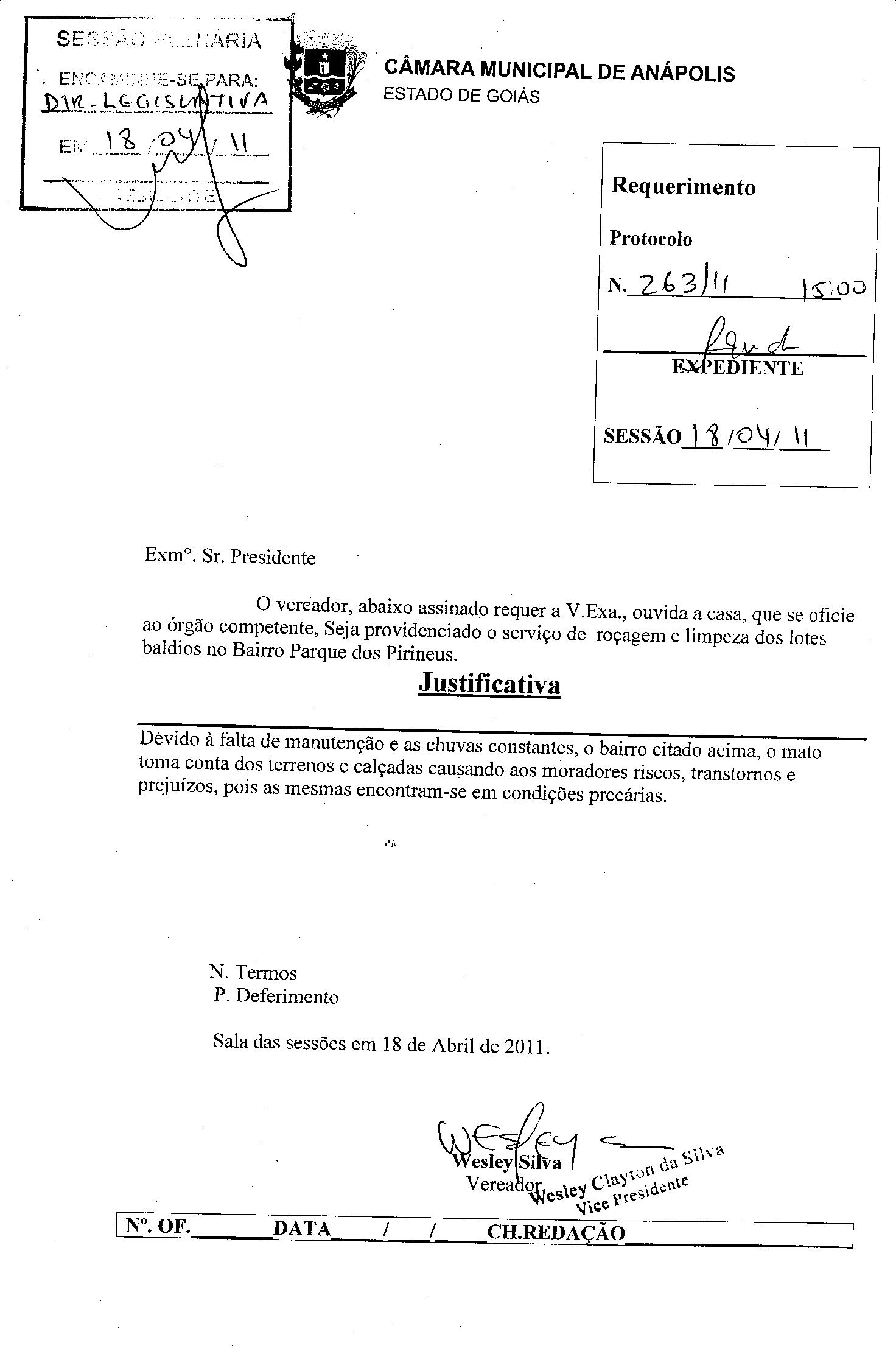 Ementa: O VEREADOR, ABAIXO ASSINANDO REQUER A V.EXA., OUVIDA A CASA, QUE SE OFÍCIE AO ÓRGÃO COMPETENTE, SEJA PROVIDENCIADO O SERVIÇO DE ROÇAGEM E LIMPEZA DOS LOTES BALDIOS NO BAIRRO PARQUE DOS PIRINEUS.
