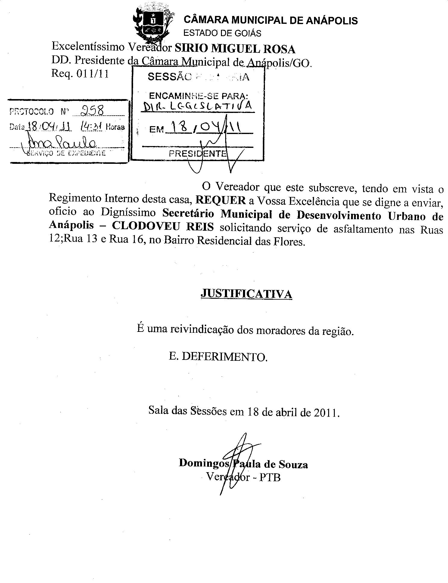 Ementa: O VEREADOR QUE ESTE SUBSCREVE, TENDO EM VISTA O REGIMENTO INTERNO DESTA CASA, REQUER A VOSSA EXCELÊNCIA QUE SE DIGNE A ENVIAR, OFÍCIO AO DIGNÍSSIMO SECRETÁRIO MUNICIPAL DE DESENVOLVIMENTO URBANO DE ANÁPOLIS - CLODOVEU REIS SOLICITANDO SERVIÇO DE ASFALTAMENTO NAS RUAS 12; RUA 13 E RUA 16, NO BAIRRO RESIDENCIAL DAS FLORES.