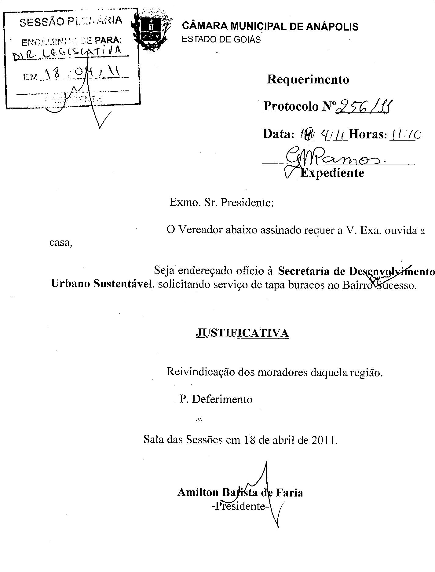 Ementa: O VEREADOR ABAIXO ASSINADO REQUER A V.EXA. OUVIDA A CASA, SEJA ENDEREÇADO OFÍCIO À SECRETÁRIA DE DESENVOLVIMENTO URBANO SUSTENTÁVEL, SOLICITANDO SERVIÇO DE TAPA BURACOS NO BAIRRO SUCESSO.