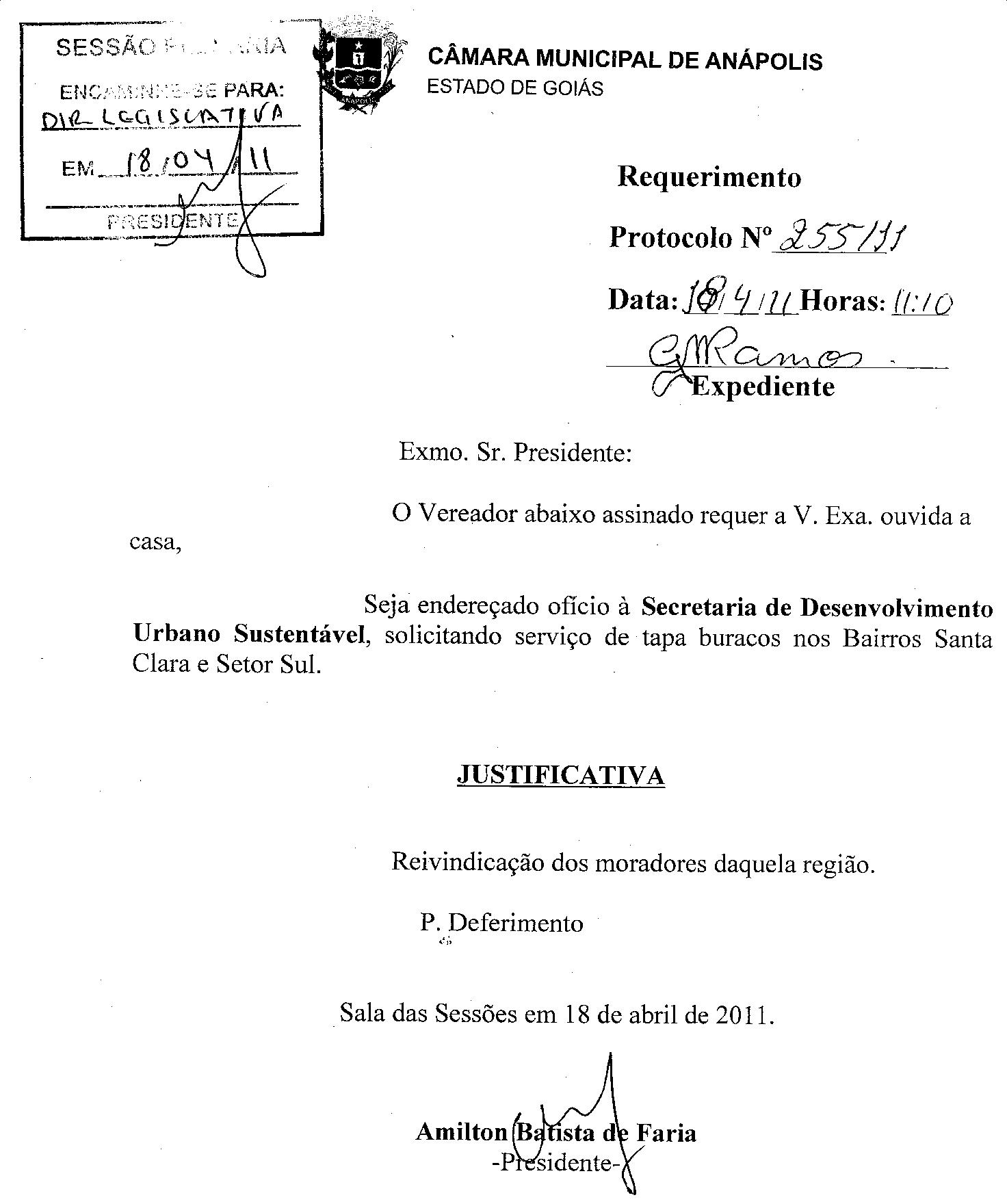 Ementa: O VEREADOR ABAIXO ASSINADO REQUER A V.EXA. OUVIDA A CASA, SEJA ENDEREÇADO OFÍCIO À SECRETARIA DE DESENVOLVIMENTO URBANO SUSTENTÁVEL, SOLICITANDO SERVIÇO DE TAPA BURACOS NOS BAIRROS SANTA CLARA E SETOR SUL.