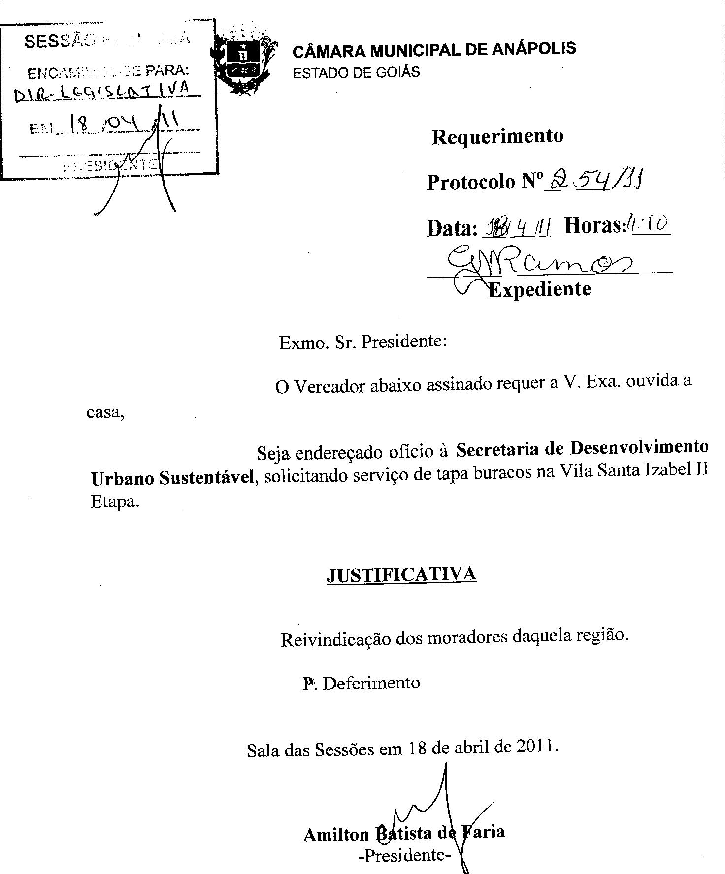 Ementa: O VEREADOR ABAIXO ASSINADO REQUER A V. EXA. OUVIDA A CASA, SEJA ENDEREÇADO OFÍCIO À SECRETARIA DE DESENVOLVIMENTO URBANO SUSTENTÁVEL, SOLICITANDO SERVIÇO DE TAPA BURACOS NA VILA SANTA IZABEL II ETAPA.