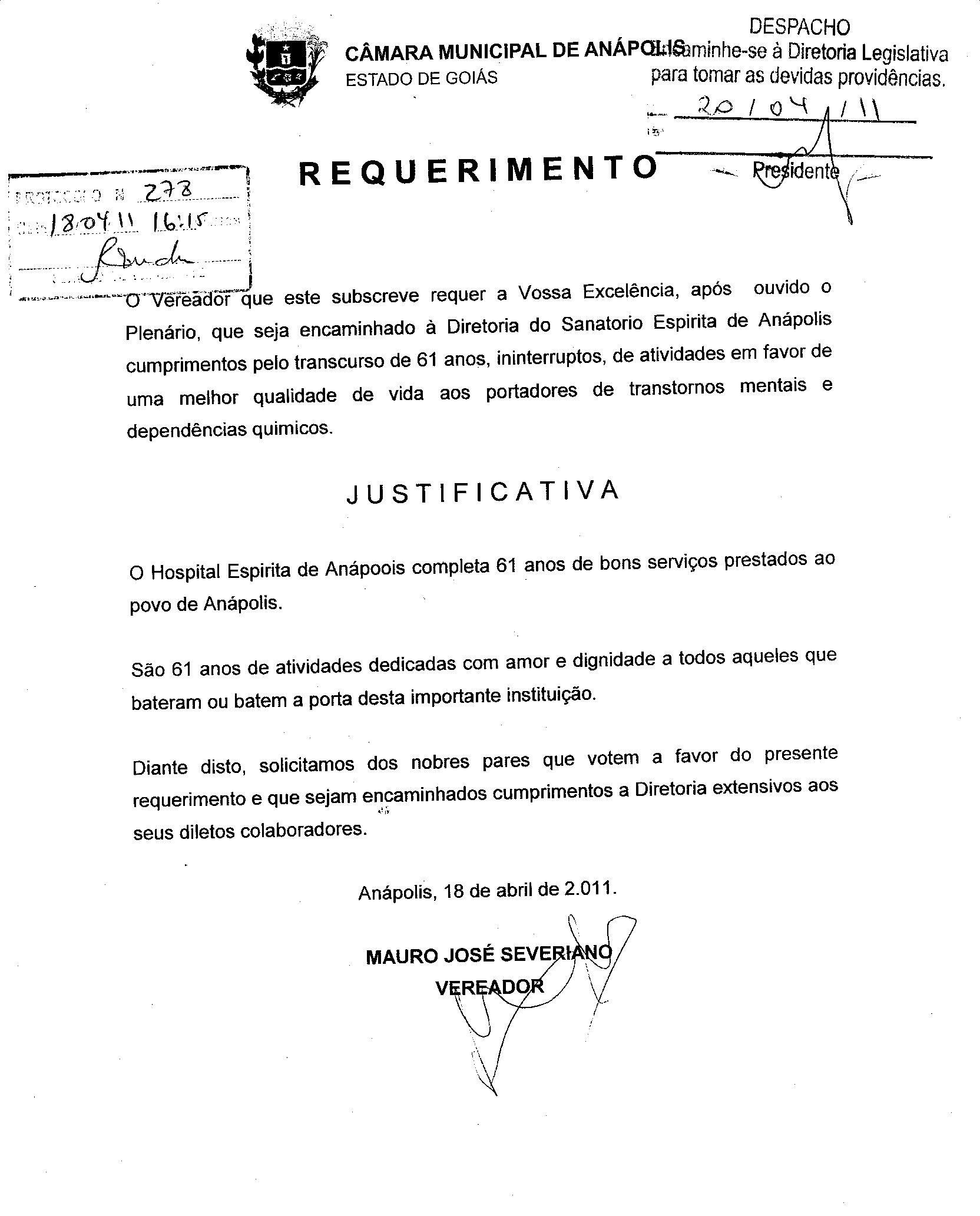 Ementa: O VEREADOR QUE ESTE SUBSCREVE REQUER A VOSSA EXCELÊNCIA, APÓS OUVIDO O PLENÁRIO, QUE SEJA ENCAMINHADO À DIRETORIA DO SANATÓRIO ESPIRITA DE ANÁPOLIS CUMPRIMENTOS PELO TRANSCURSO DE 61 ANOS, ININTERRUPTOS, DE ATIVIDADES EM FAVOR DE UMA MELHOR QUALIDADE DE VIDA AOS PORTADORES DE TRANSTORNOS MENTAIS E DEPENDÊNCIAS QUIMICOS.