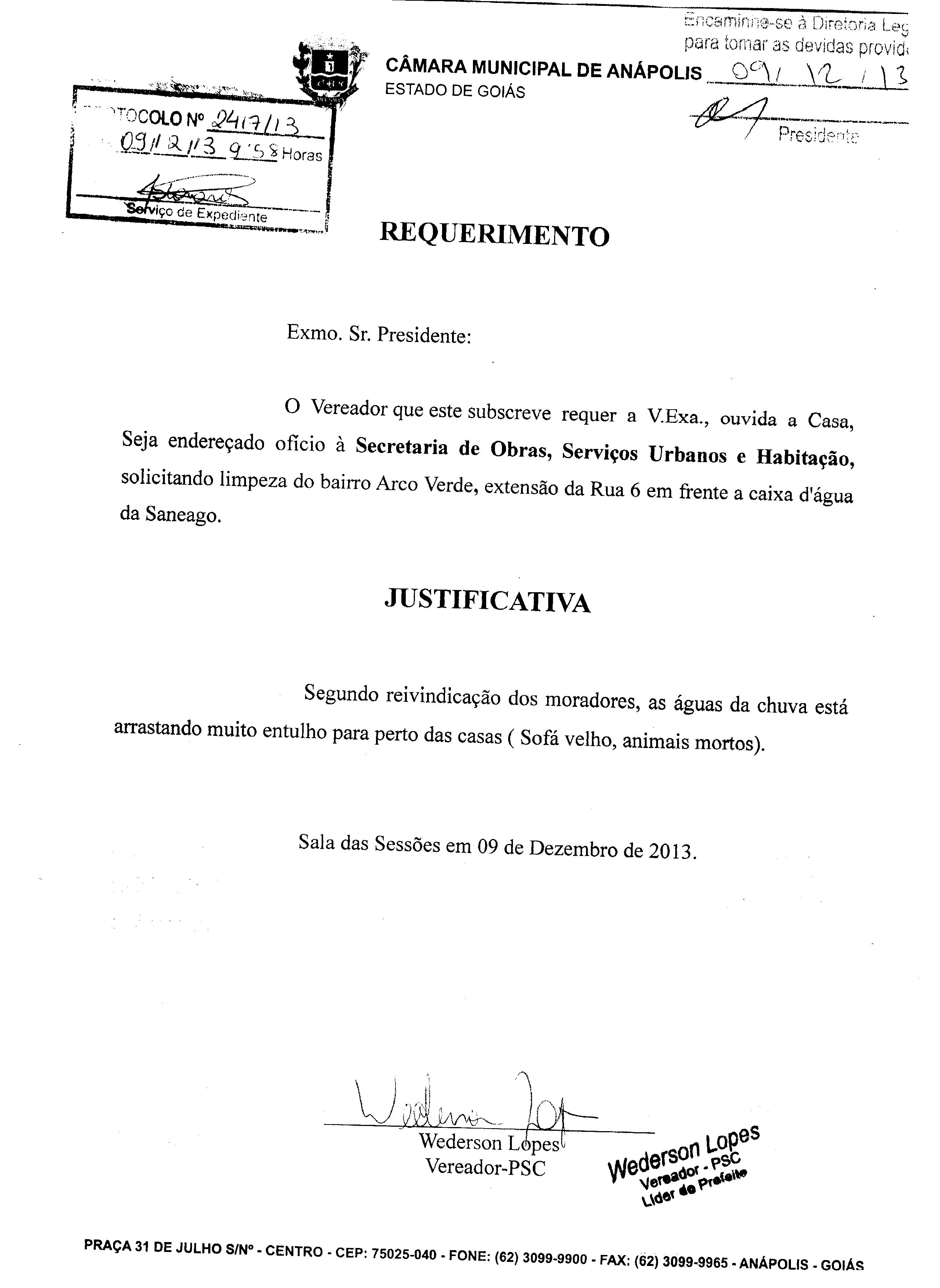 Ementa: À SECRETARIA MUNICIPAL DE OBRAS, SERVIÇOS URBANOS E HABITAÇÃO, SOLICITANDO LIMPEZA DO BAIRRO ARCO VERDE, EXTENÇÃO DA RUA 6 EM FRENTE A CAIXA D'ÁGUA DA SANEAGO