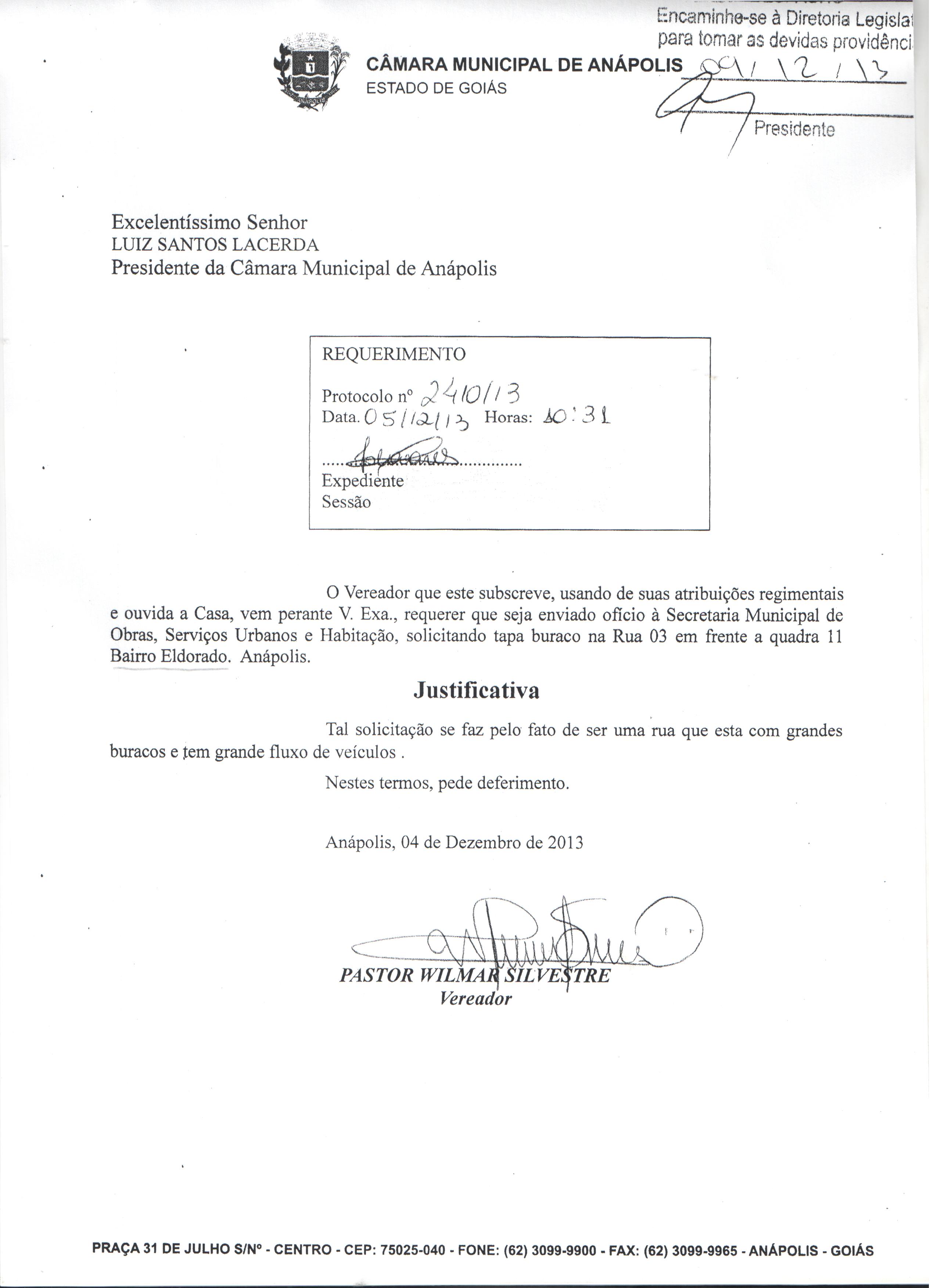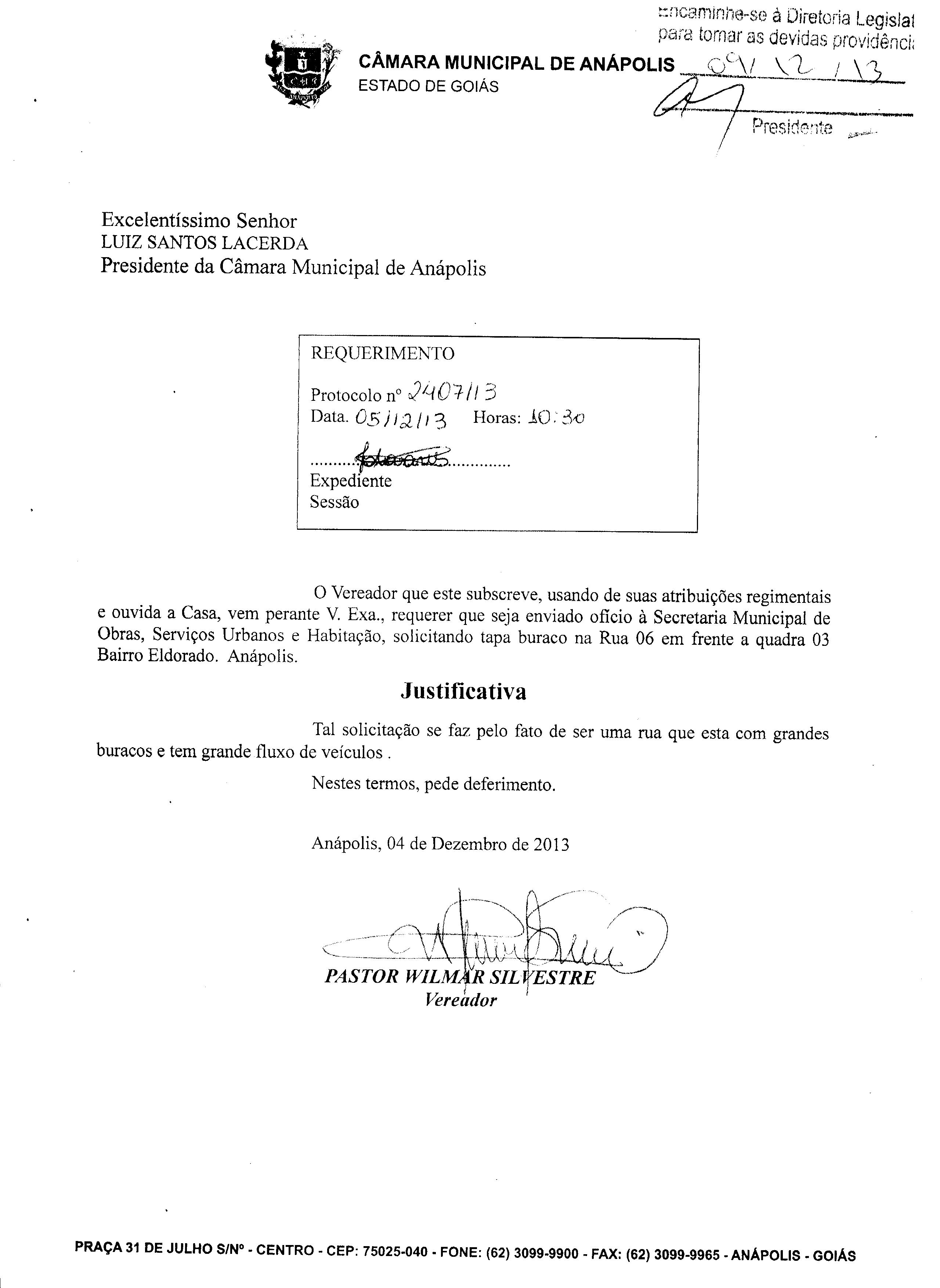 Ementa: À SECRETARIA MUNICIPAL DE OBRAS, SERVIÇOS URBANOS E HABITAÇÃO, SOLICITANDO TAPA BURACO NA RUA 01 ESQUINA COM RUA 06 EM FRENTE A QUADRA 06 BAIRRO ELDORADO. ANÁPOLIS.