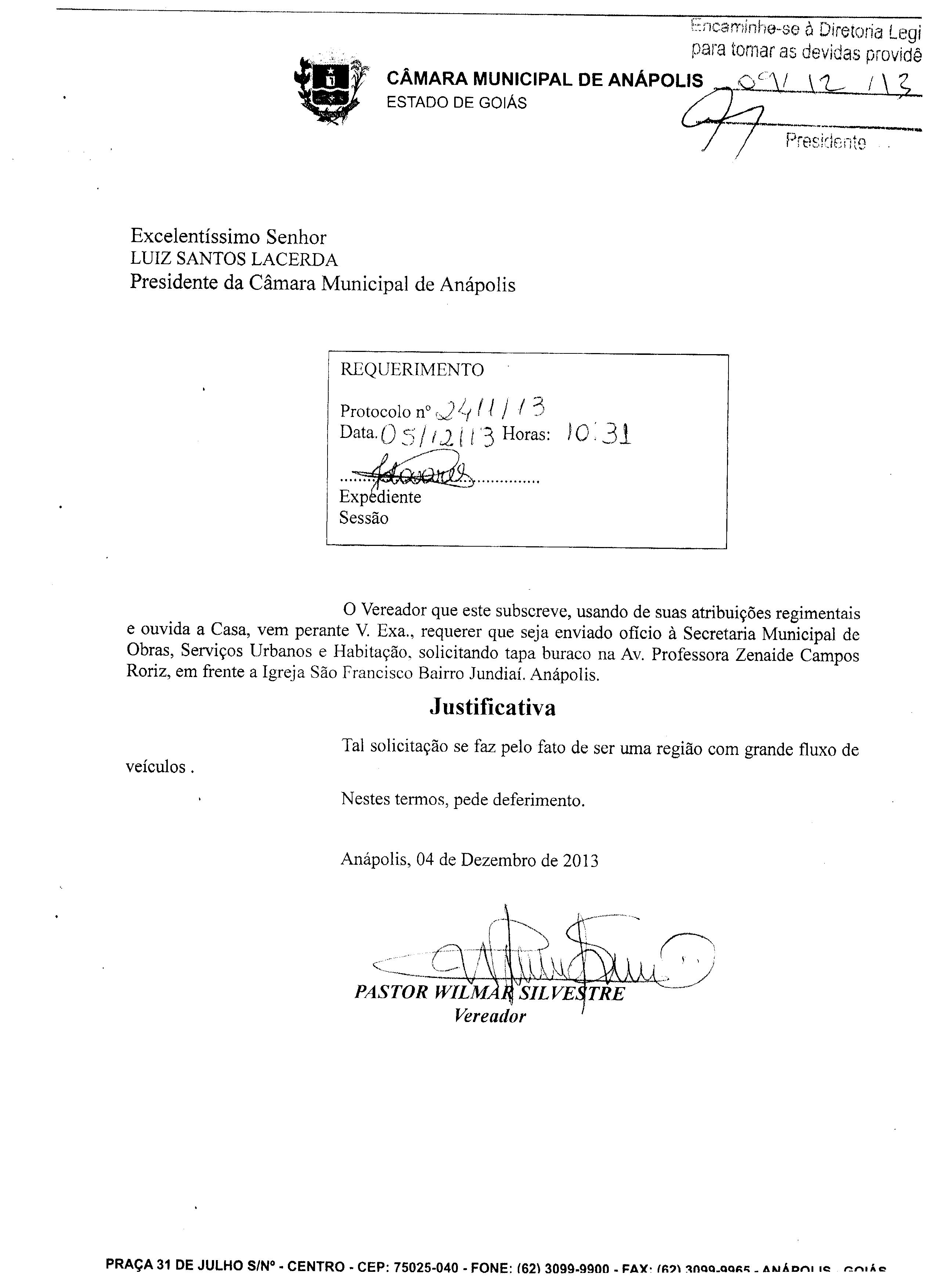 Ementa: À SECRETARIA MUNICIPAL DE OBRAS, SERVIÇOS URBANOS E HABITAÇÃO, SOLICITANDO TAPA BURACO NA AVENIDA PROFESSORA ZENAIDE CAMPOS RORIZ, EM FRENTE A IGREJA SÃO FRANCISCO BAIRRO JUNDIAÍ.