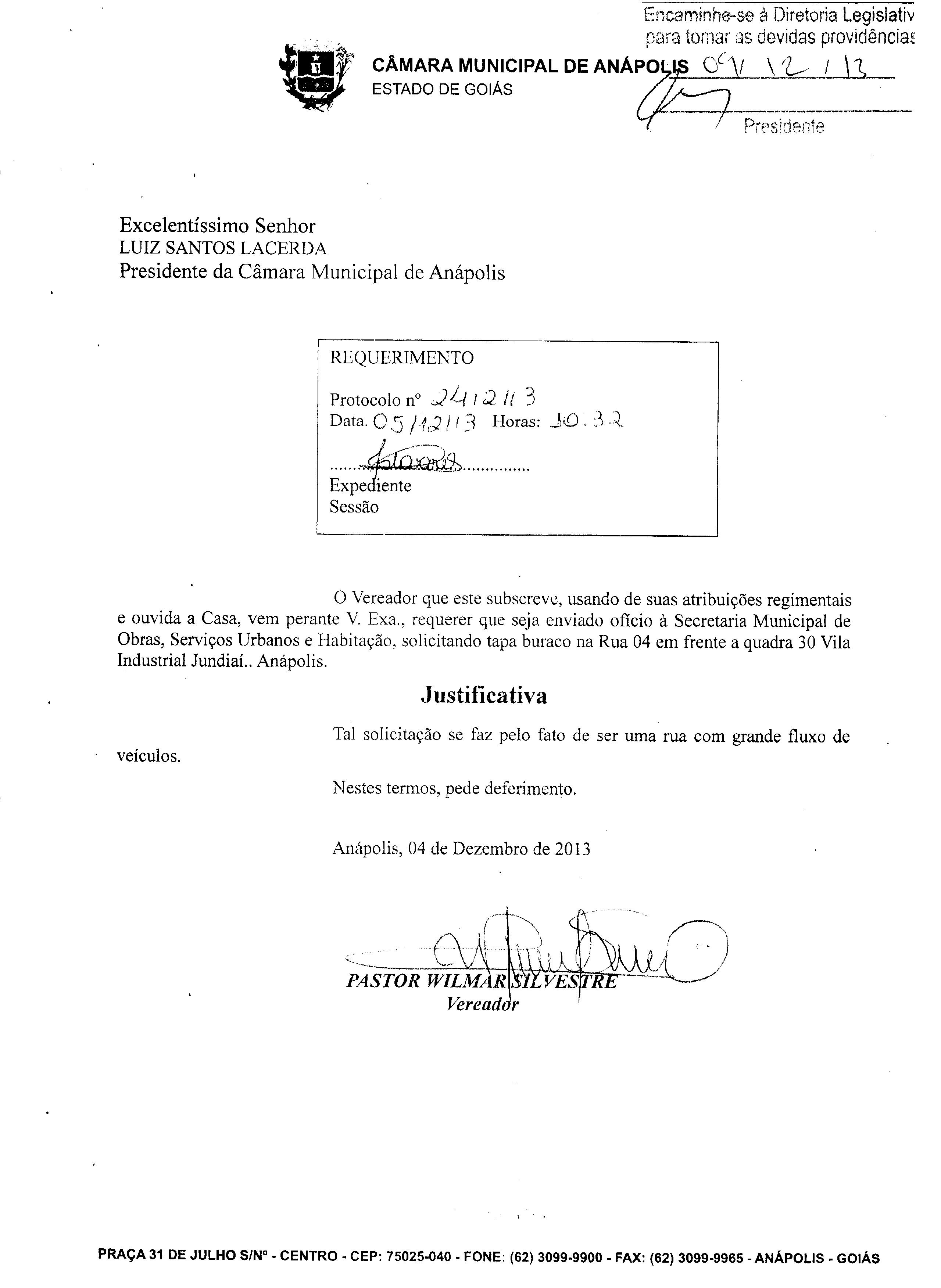 Ementa: À SECRETARIA MUNICIPAL DE OBRAS, SERVIÇOS URBANOS E HABITAÇÃO, SOLICITANDO TAPA BURACO NA RUA 04 EM FRENTE A QUADRA 30 VILA INDUSTRIAL JUNDIAÍ. ANÁPOLIS.