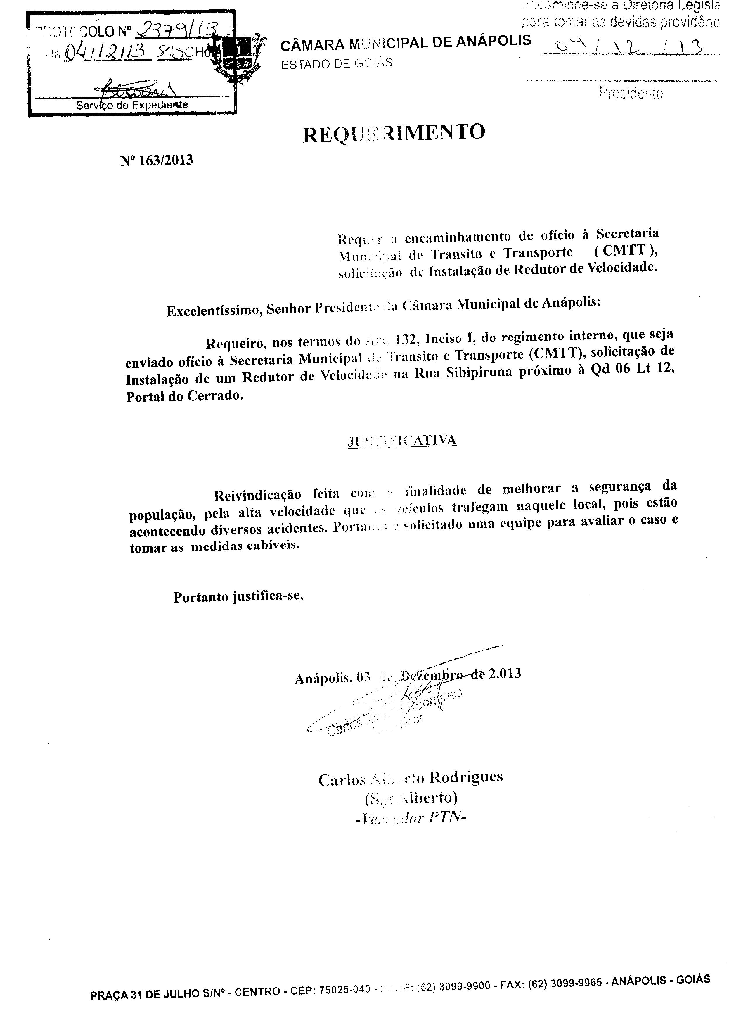 Ementa: À SECRETARIA MUNICIPAL DE TRÂNSITO E TRANSPORTE(CMTT), SOLICITAÇÃO DE INSTALAÇÃO DE UM REDUTOR DE VELOCIDADE NA RUA SIBIPIRUNA PRÓXIMO À QD 06 LT 12, PORTAL DO CERRADO.
