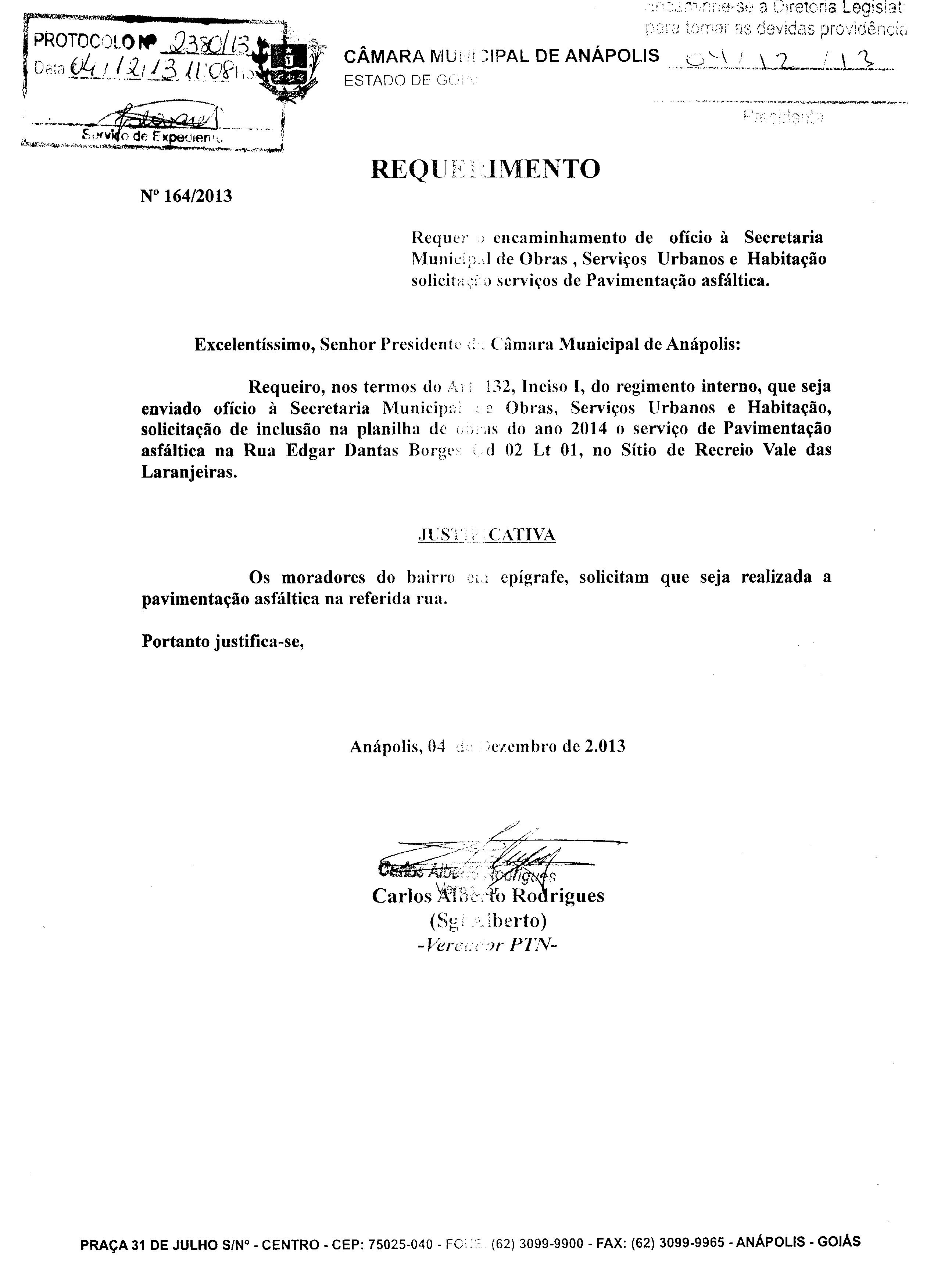 Ementa: À SECRETARIA MUNICIPAL DE OBRAS, SERVIÇOS URBANOS E HABITAÇÃO, SOLICITAÇÃO DE INCLUSÃO NA PLANILHA DE OBRAS DO ANO 2014 O SERVIÇO DE PAVIMENTAÇÃO ASFÁLTICA NA RUA EDGAR DANTAS BORGES QD 02 LT. 01, NO SÍTIO DE RECREIO VALE DAS LARANJEIRAS.