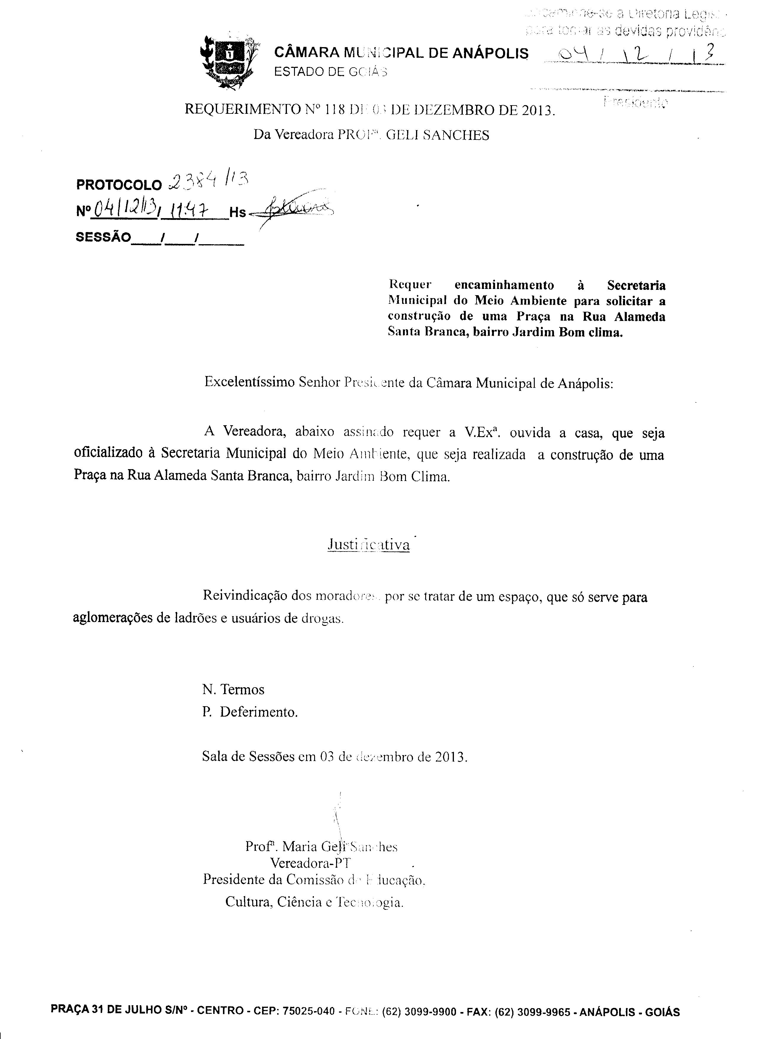 Ementa: À SECRETARIA MUNICIPAL DO MEIO AMBIENTE, QUE SEJA REALIZADA A CONSTRUÇÃO DE UMA PRAÇA NA ALAMEDA SANTA BRANCA, BAIRRO JARDIM BOM CLIMA.