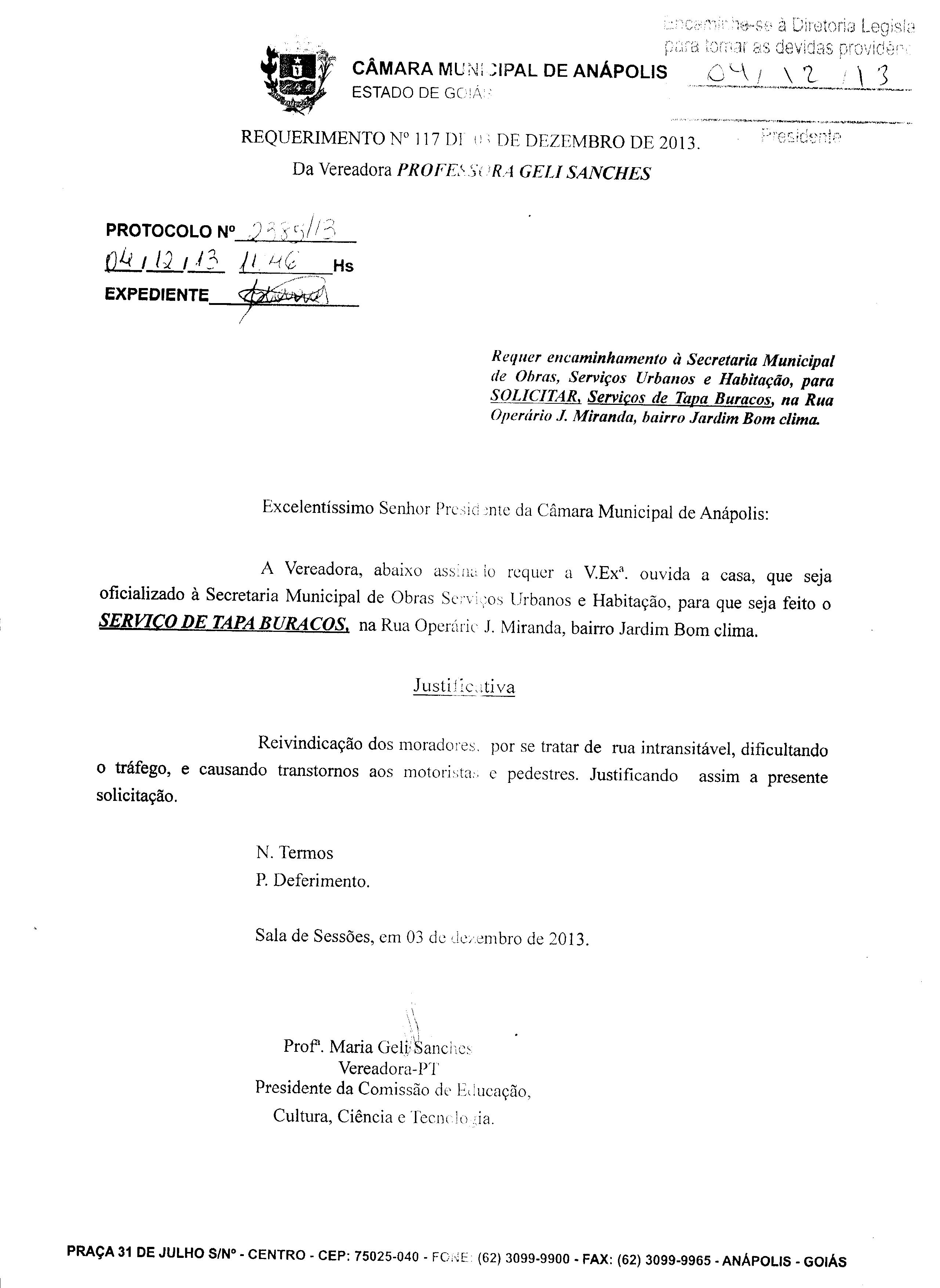 Ementa: À SECRETARIA MUNICIPAL DE OBRAS SERVIÇOS URBANOS E HABITAÇÃO, PARA QUE SEJA FEITO O SERVIÇO DE TAPA BURACO, NA RUA OPERÁRIO J. MIRANDA, BAIRRO JARDIM BOM CLIMA.