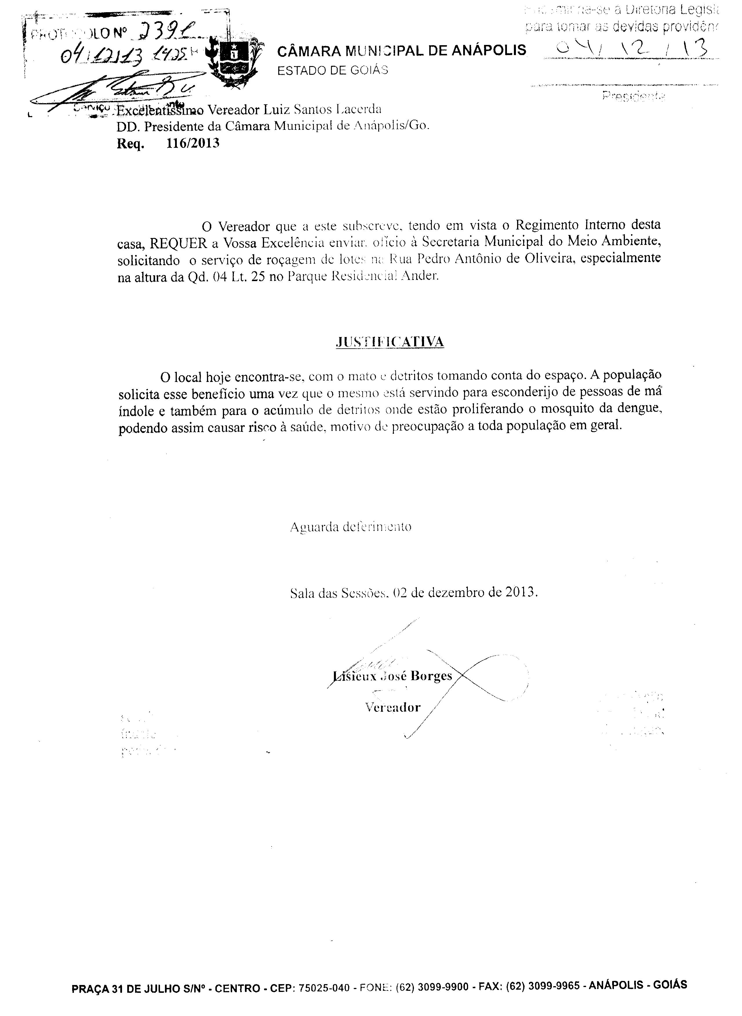 Ementa: À SECRETARIA MUNICIPAL DO MEIO AMBIENTE, SOLICITANDO O SERVIÇO DE ROÇAGEM DE LOTES NA RUA PEDRO ANTÔNIO DE OLIVEIRA, ESPECIALMENTE NA ALTURA DA QD.04 LT. 25 NO PARQUE RESIDENCIAL ANDER.