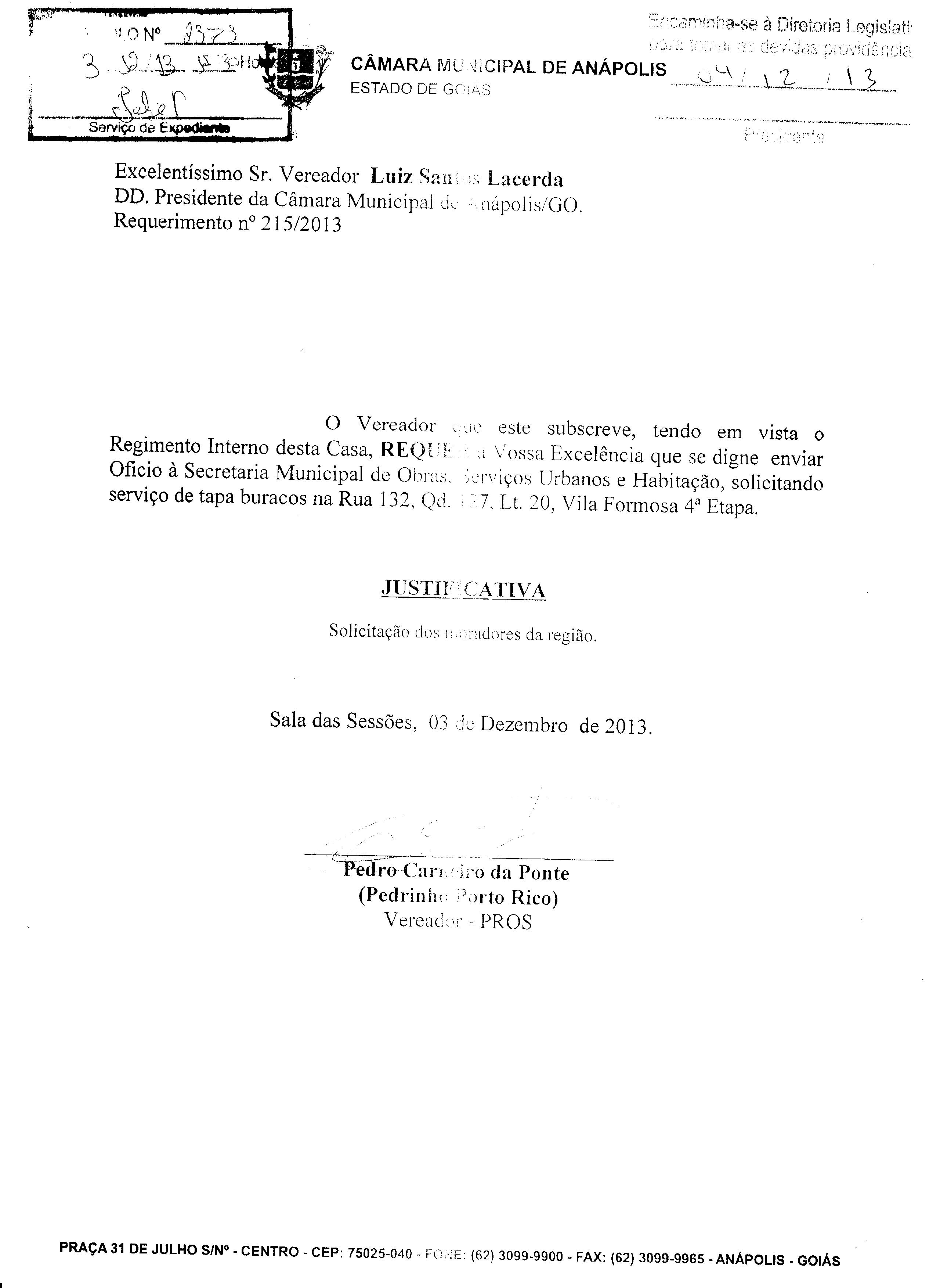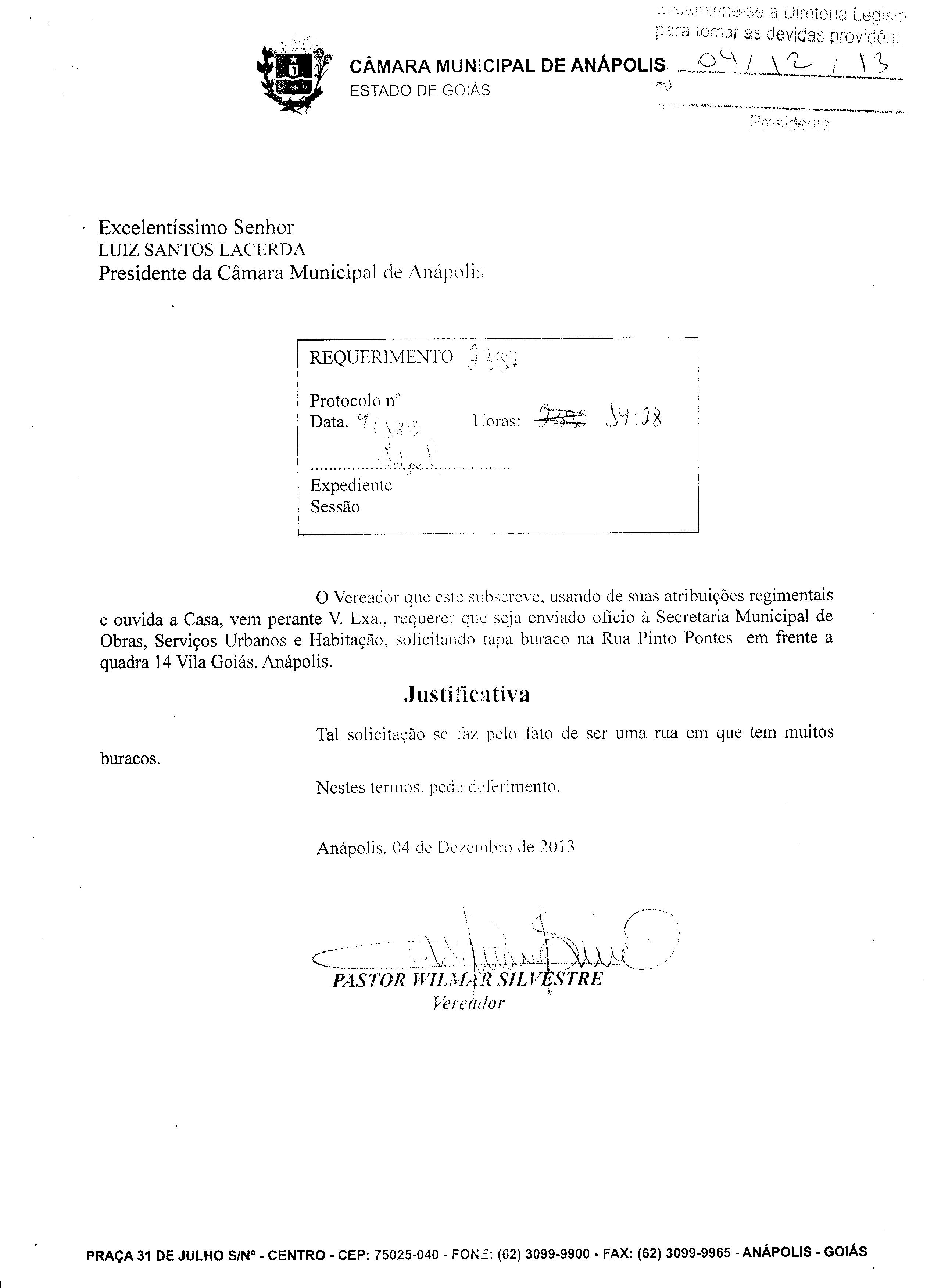 Ementa: À SECRETARIA MUNICIPAL DE OBRAS, SERVIÇOS URBANOS E HABITAÇÃO, SOLICITANDO TAPA BURACO NA RUA PINTO PONTES EM FRENTE A QUADRA 14 VILA GOIÁS ANÁPOLIS.