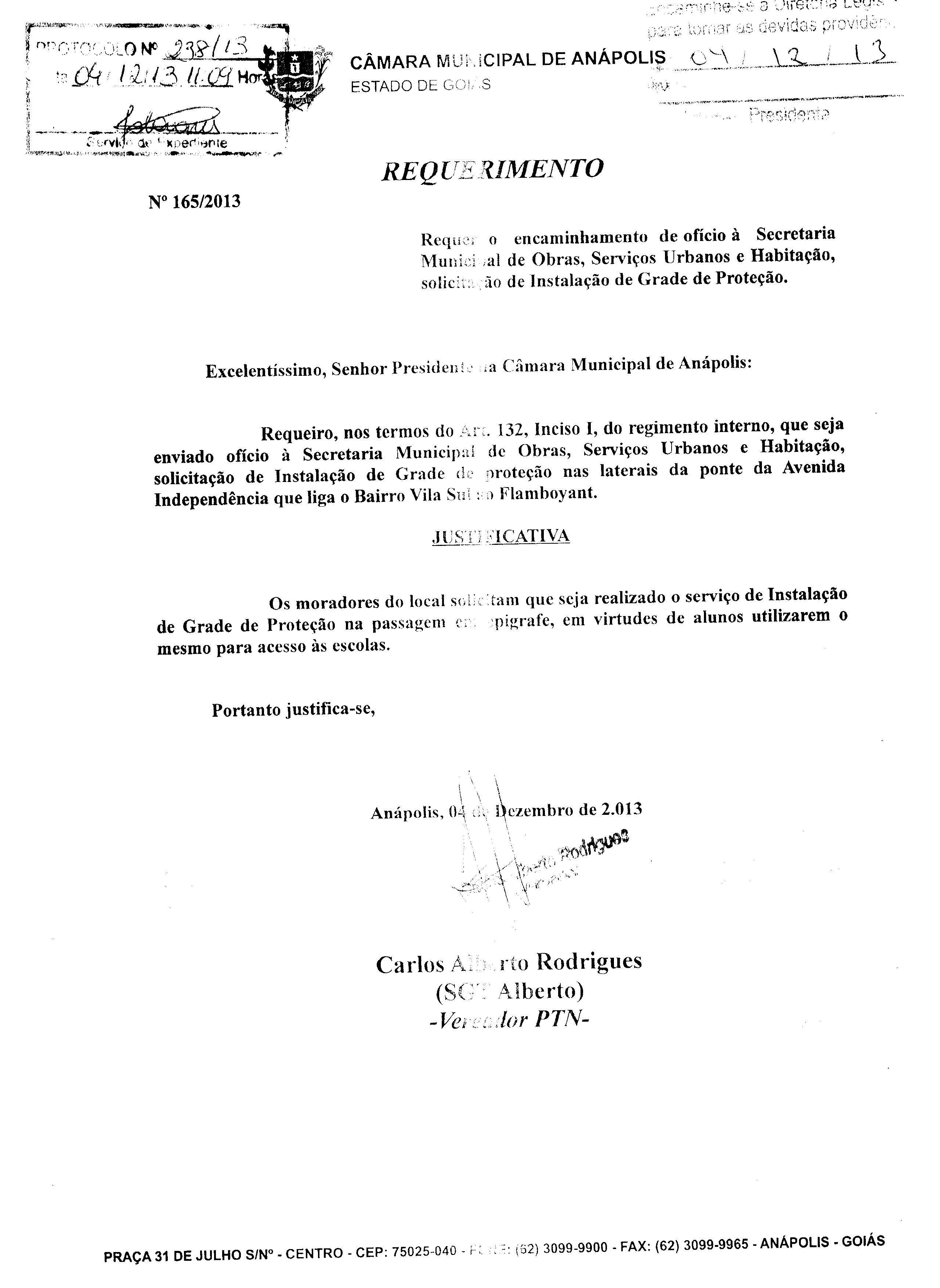 Ementa: À SECRETARIA MUNICIPAL DE OBRAS, SERVIÇOS URBANOS E HABITAÇÃO, SOLICITANDO INSTALAÇÃO DE GRADE DE PROTEÇÃO NAS LATERAIS DA PONTE DA AVENIDA INDEPENDÊNCIA QUE LIGA O BAIRRO VILA SUL AO FLAMBOYANT.