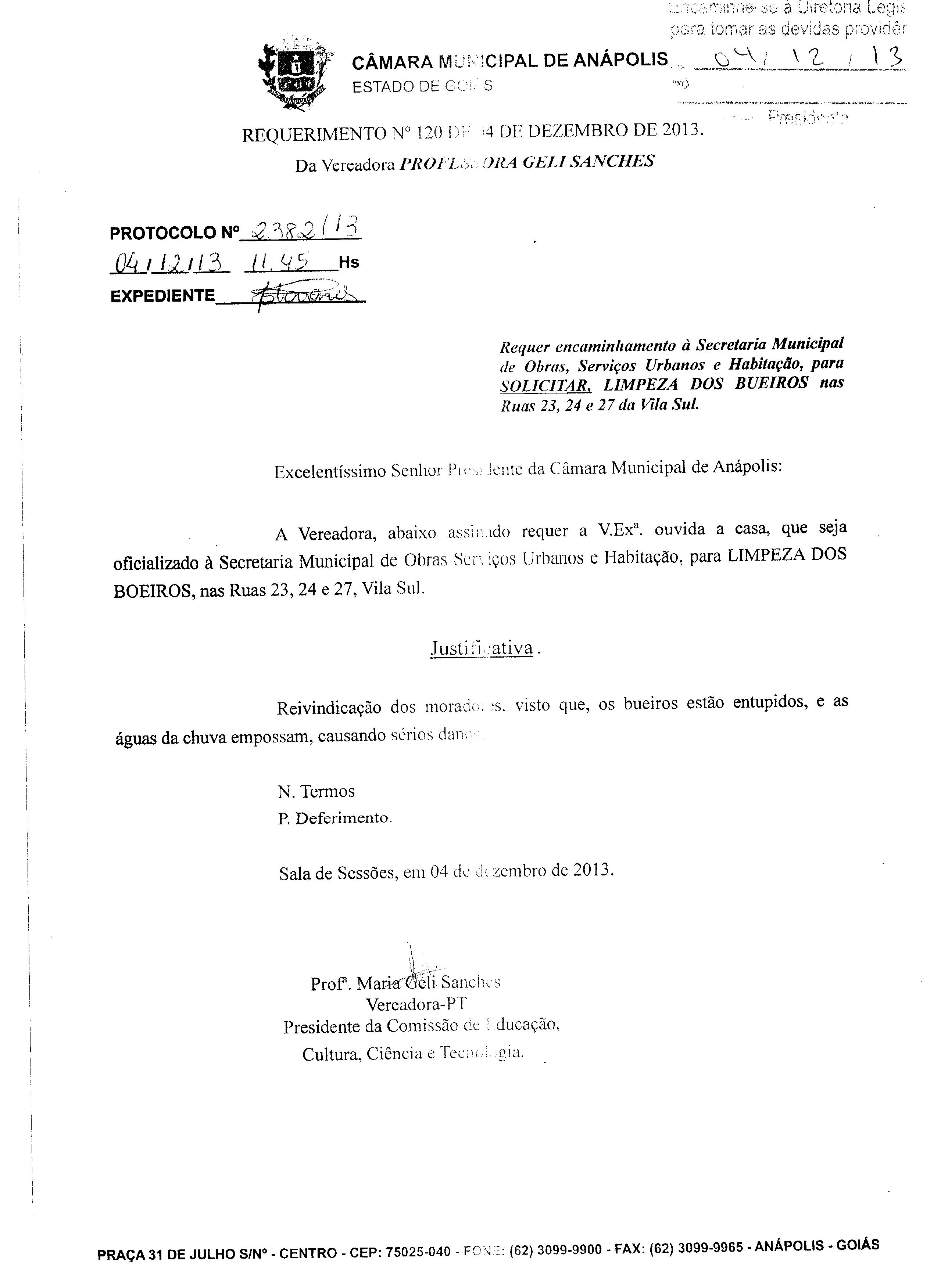 Ementa: À SECRETARIA MUNICIPAL DE OBRAS, SERVIÇOS URBANOS E HABITAÇÃO, PARA LIMPEZA DOS BOEIROS, NAS RUAS 23, 24 E 27, VILA SUL.