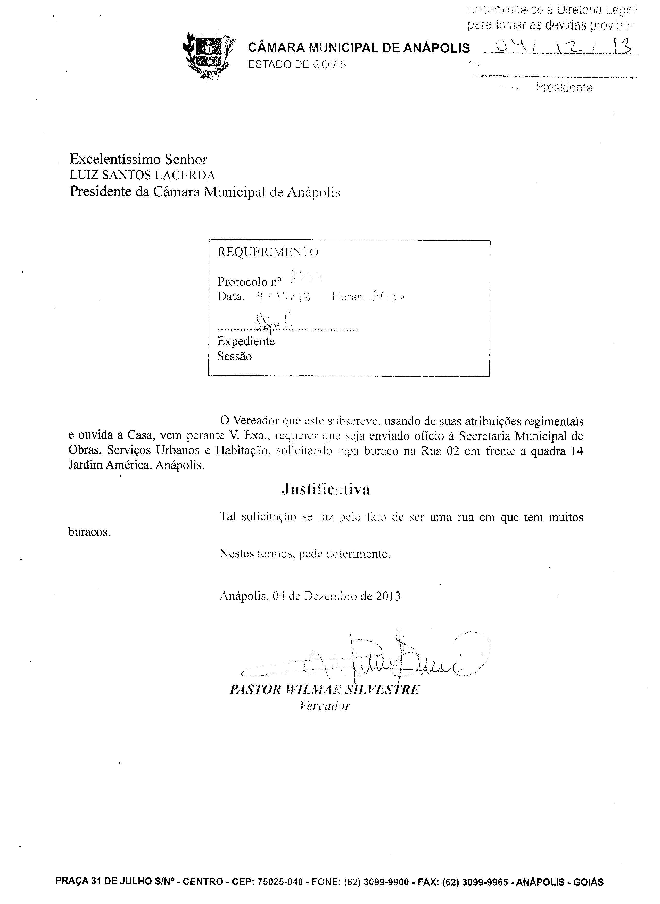 Ementa: À SECRETARIA MUNICIPAL DE OBRAS, SERVIÇOS URBANOS E HABITAÇÃO, SOLICITADO TAPA BURACO NA RUA 02 EM FRENTE A QUADRA 14 JARDIM AMÉRICA. ANÁPOLIS.