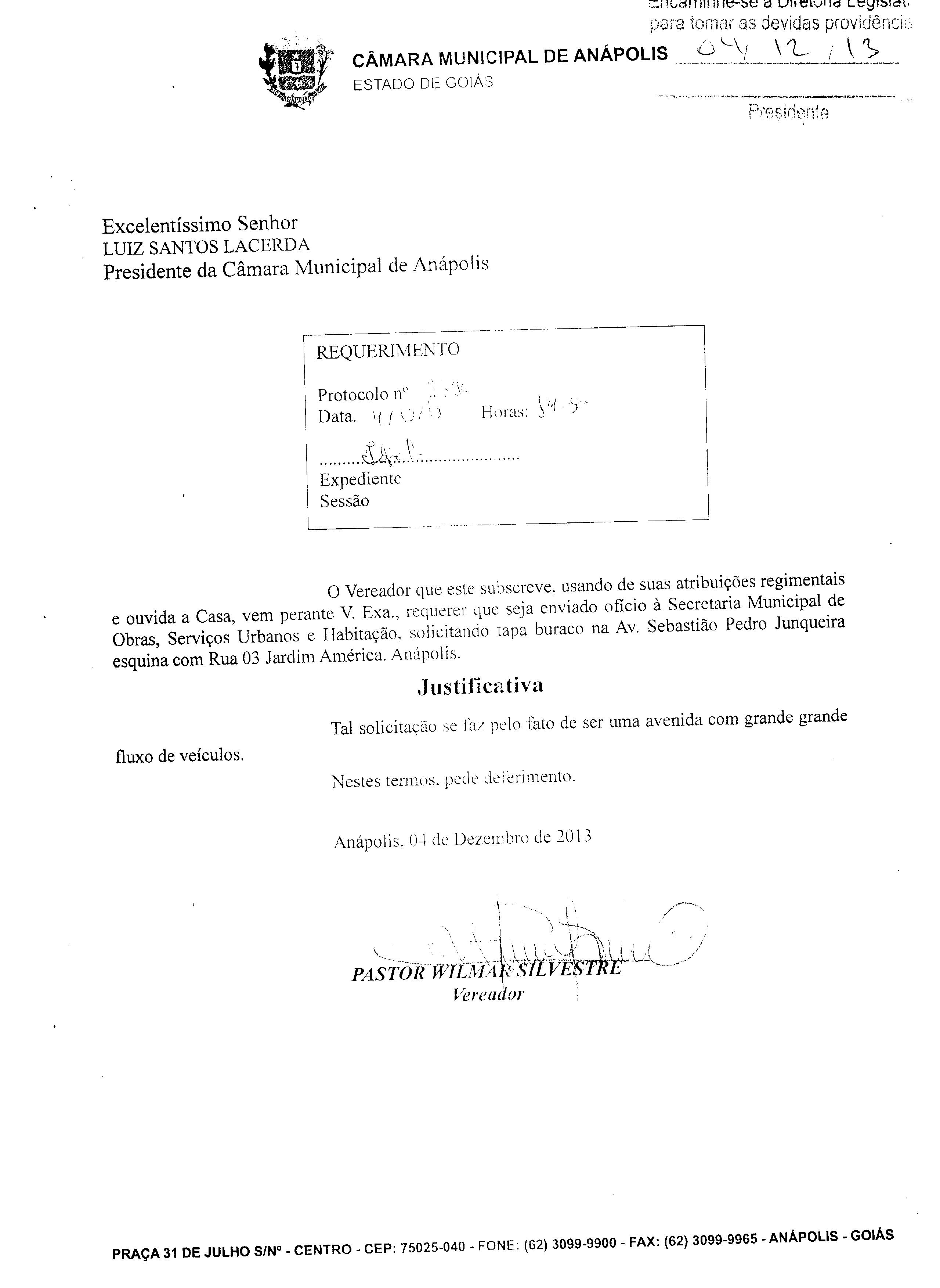 Ementa: À SECRETARIA MUNICIPAL DE OBRAS, SERVIÇOS URBANOS E HABITAÇÃO, SOLICITANDO TAPA BURACO NA AV. SEBASTIÃO PEDRO JUNQUEIRA ESQUINA COM RUA 03 JARDIM AMÉRICA. ANÁPOLIS.