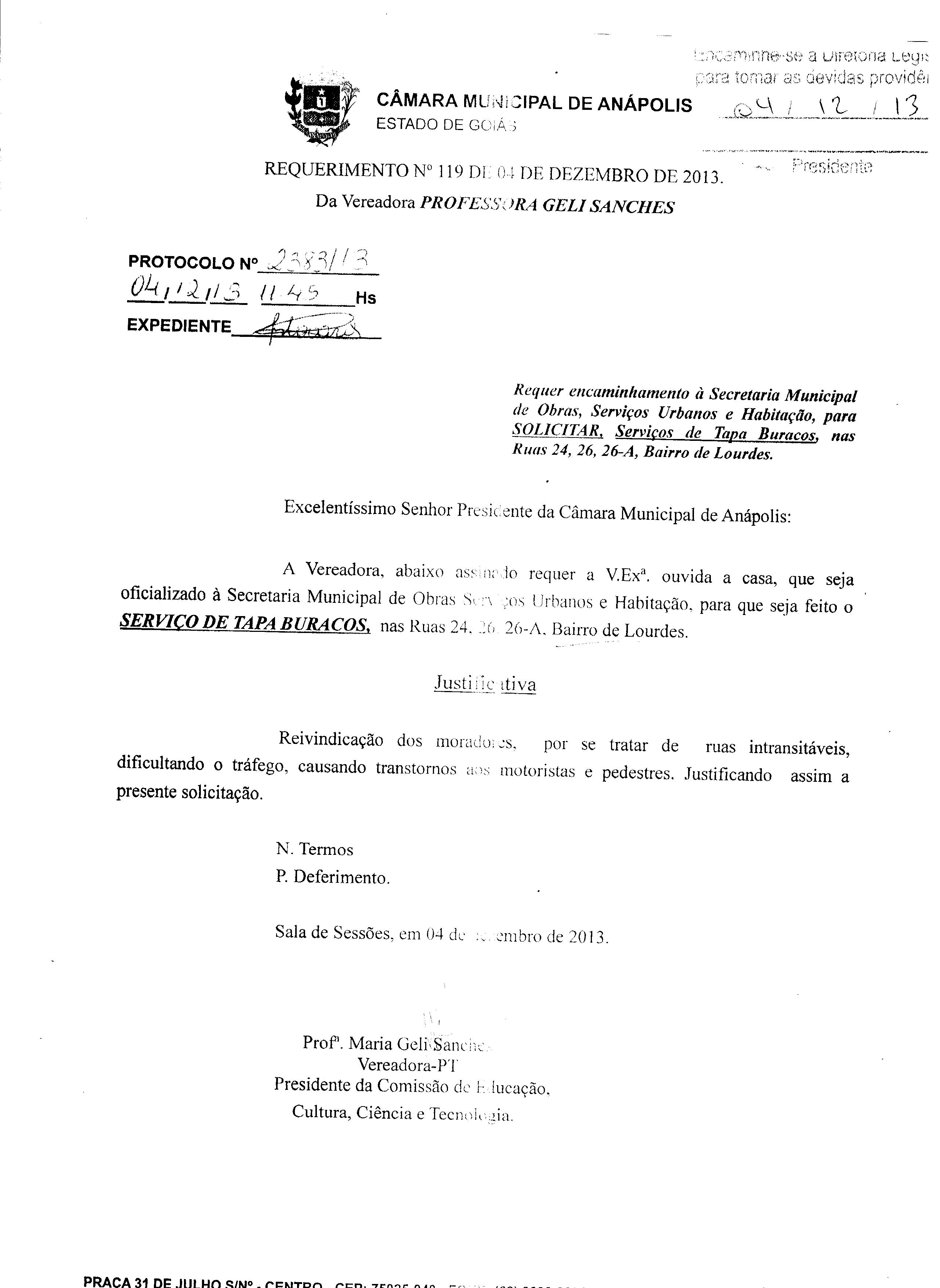 Ementa: À SECRETARIA MUNICIPAL DE OBRAS SERVIÇOS URBANOS E HABITAÇÃO, PARA QUE SEJA FITO O SERVIÇO DE TAPA BURACOS, NAS RUAS 24, 26, 26-A, BAIRRO DE LOURDES.
