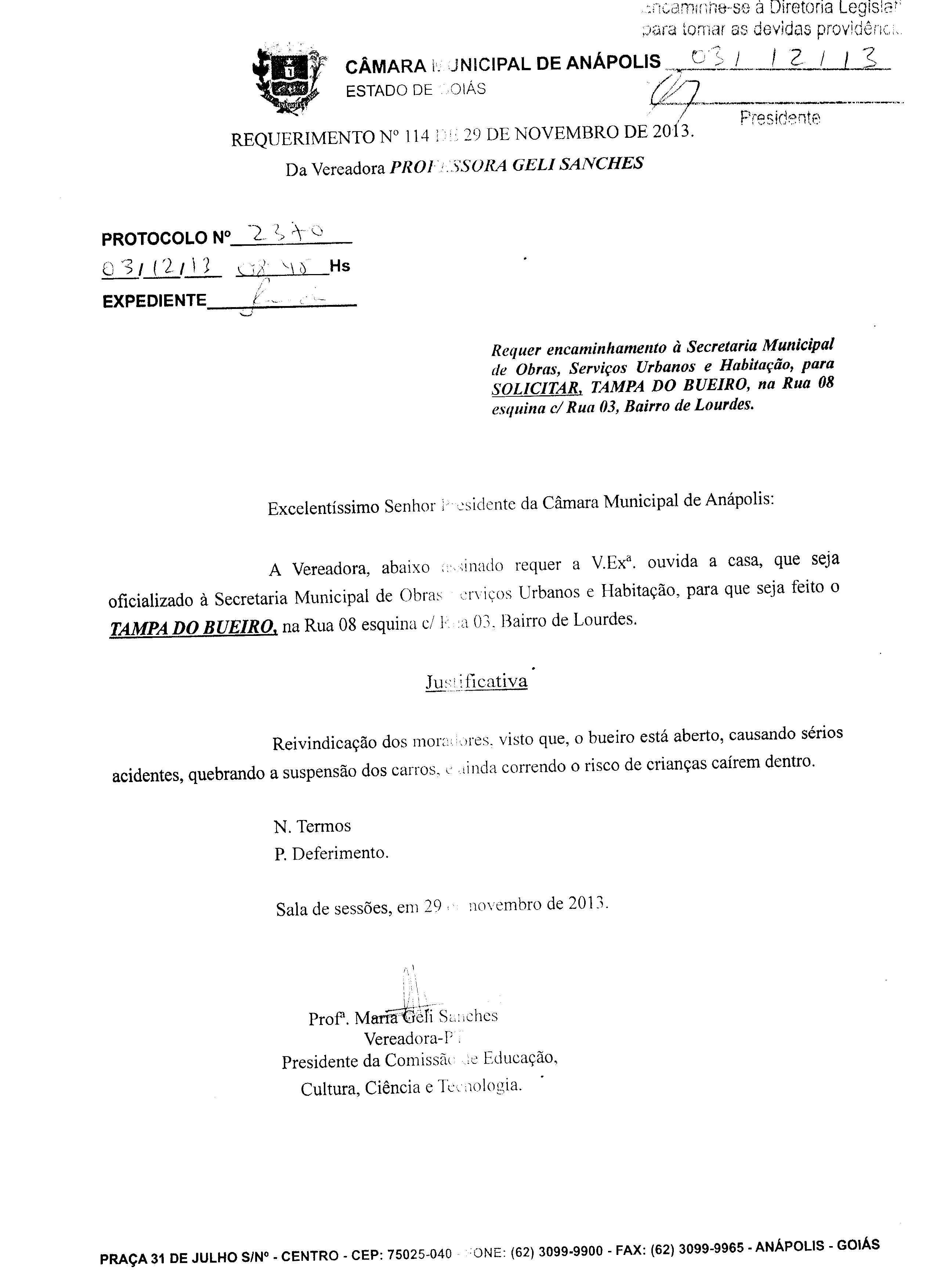 Ementa: À SECRETARIA MUNICIPAL DE OBRAS SERVIÇOS URBANOS E HABITAÇÃO, PARA COLOCAÇÃO DA TAMPA DO BUEIRO,NA RUA 10 ESQUINA C/ RUA 03, BAIRRO DE LOURDES.