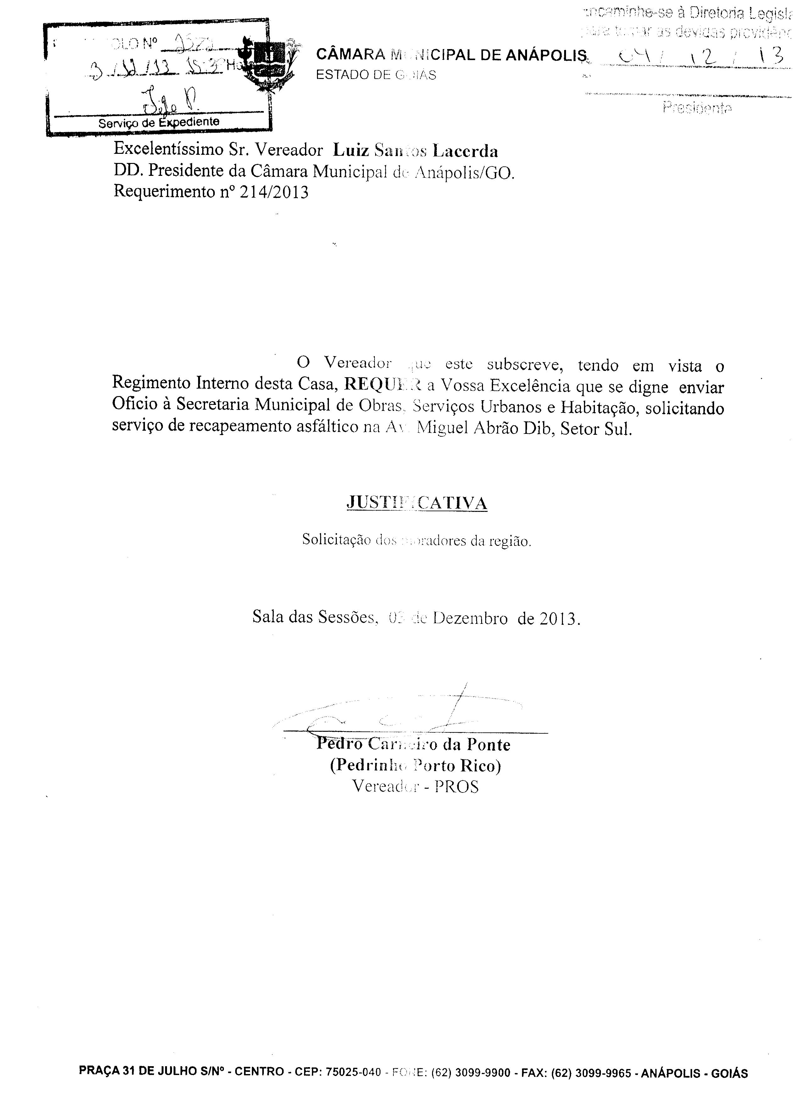 Ementa: À SECRETARIA MUNICIPAL DE OBRAS, SERVIÇOS URBANOS E HABITAÇÃO, SOLICITANDO SERVIÇO DE RECAPEAMENTO ASFÁLTICO NA AV. MIGUEL ABRÃO DIB, SETOR SUL.