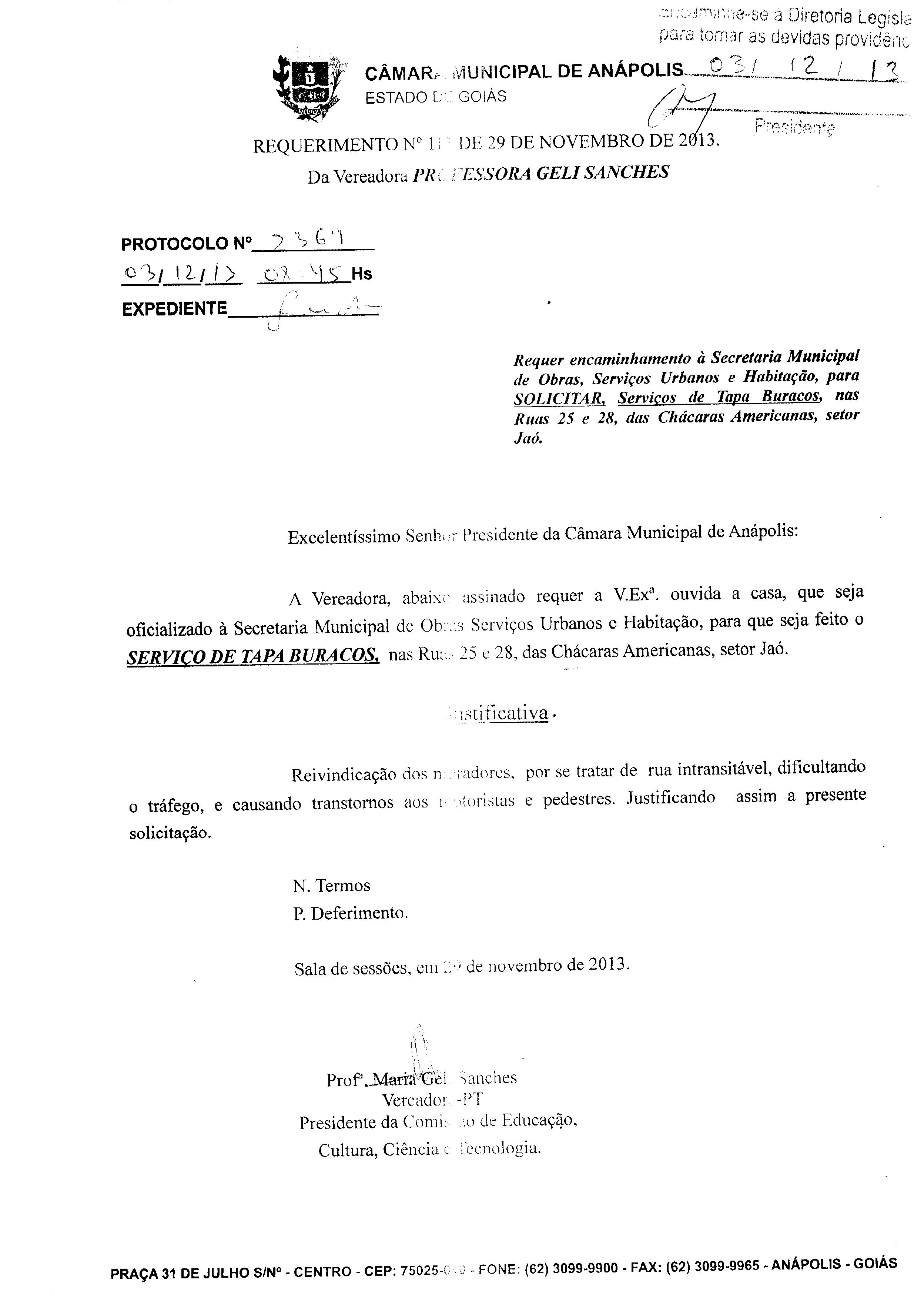 Ementa: À SECRETARIA MUNICIPAL DE OBRAS SERVIÇOS URBANOS E HABITAÇÃO, PARA QUE SEJAFEITO O SERVIÇO DE TAPA BURACOS, NAS RUAS 25 E 28, DAS CHÁCARAS AMERICANAS, SETOR JAÓ.
