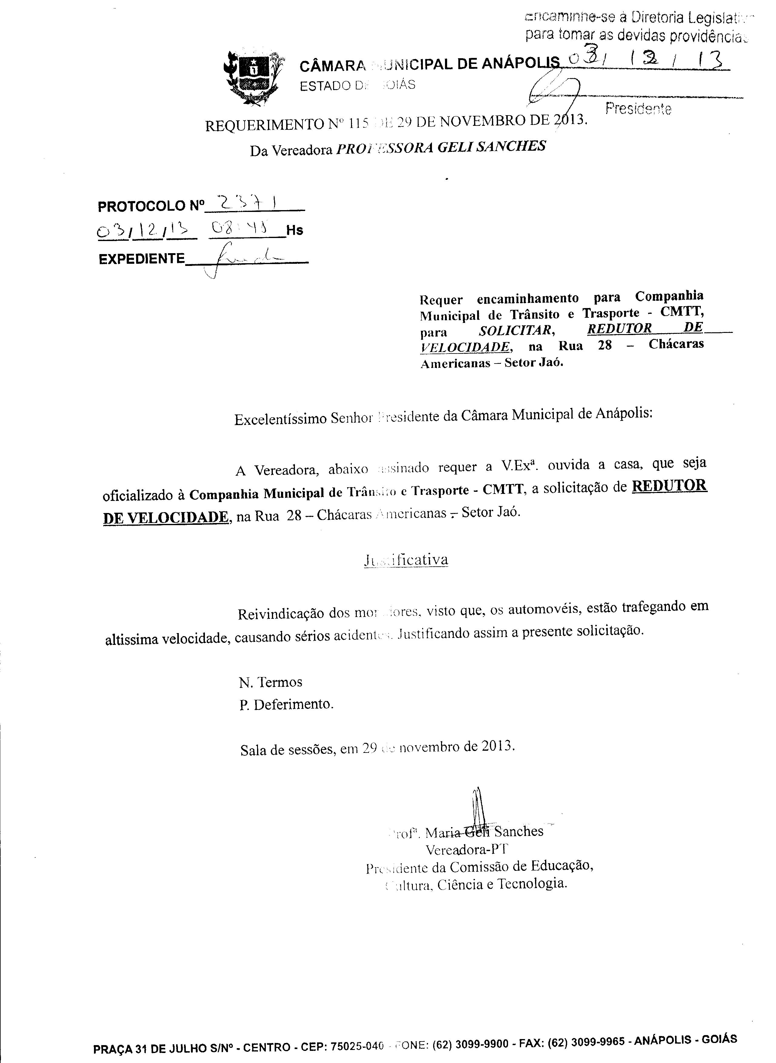 Ementa: À COMPANHIA MUNICIPAL DE TRÂNSITO- CMTT, A SOLICITAÇÃO DE REDUTOR DE VELOCIDADE, NA RUA 28- CHÁCARAS AMERICANAS- SETOR JAÓ.