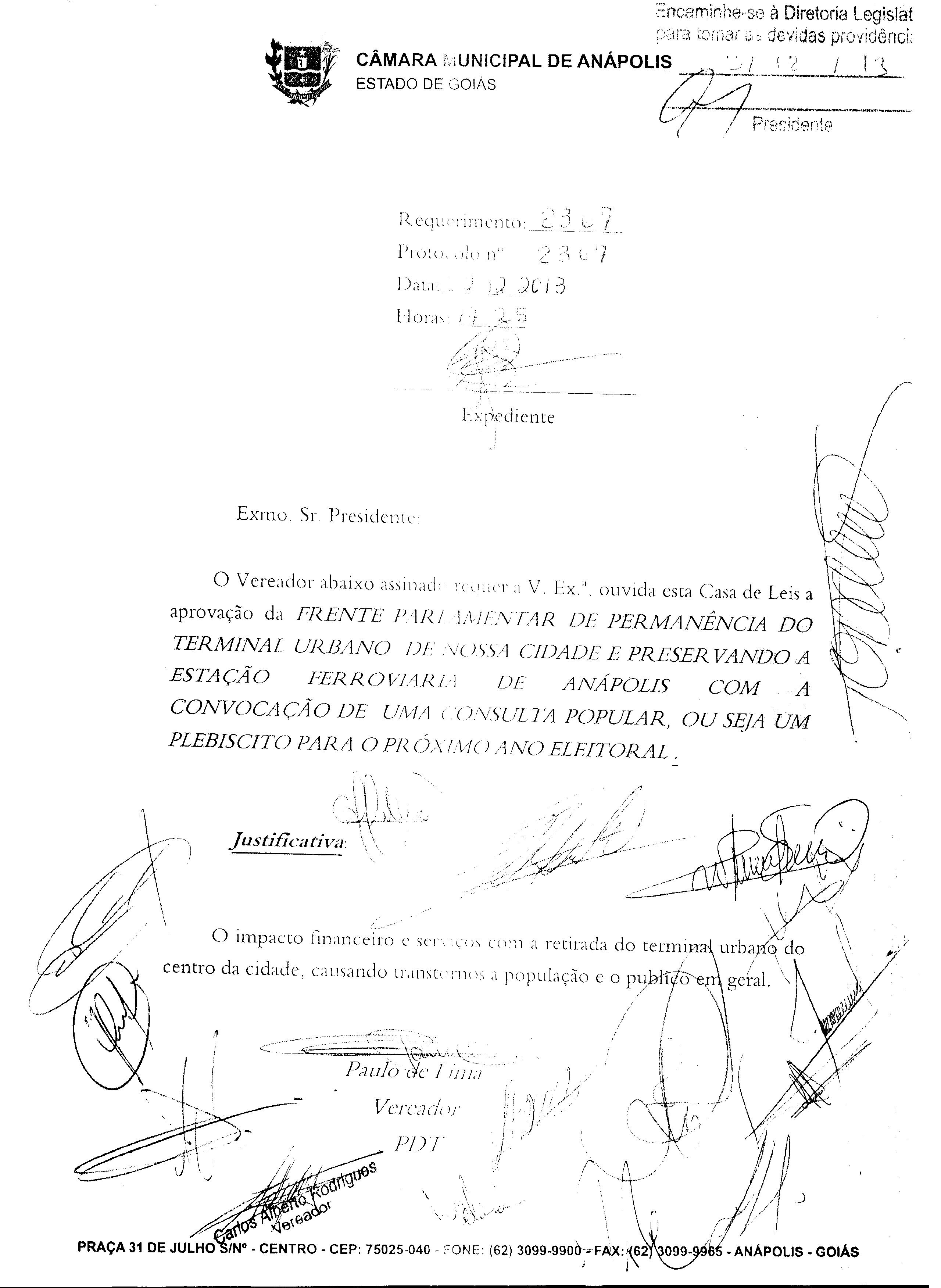 Ementa: O VEREADOR ABAIXO ASSINADO REQUER A V. EX.ª, OUVIDA ESTA CASA DE LEIS A APROVAÇÃO DA FRENTE PARLAMENTAR DE PERMANÊNCIA DO TERMINAL URBANO DE NOSSA CIDADE E PRESERVANDO A ESTAÇÃO FERROVIARIA DE ANÁPOLIS COM A CONVOCAÇÃO DE UMA CONSULTA POPULAR, OU SEJA UM PLEBISCITO PARA O PRÓXIMO ANO ELEITORAL.
