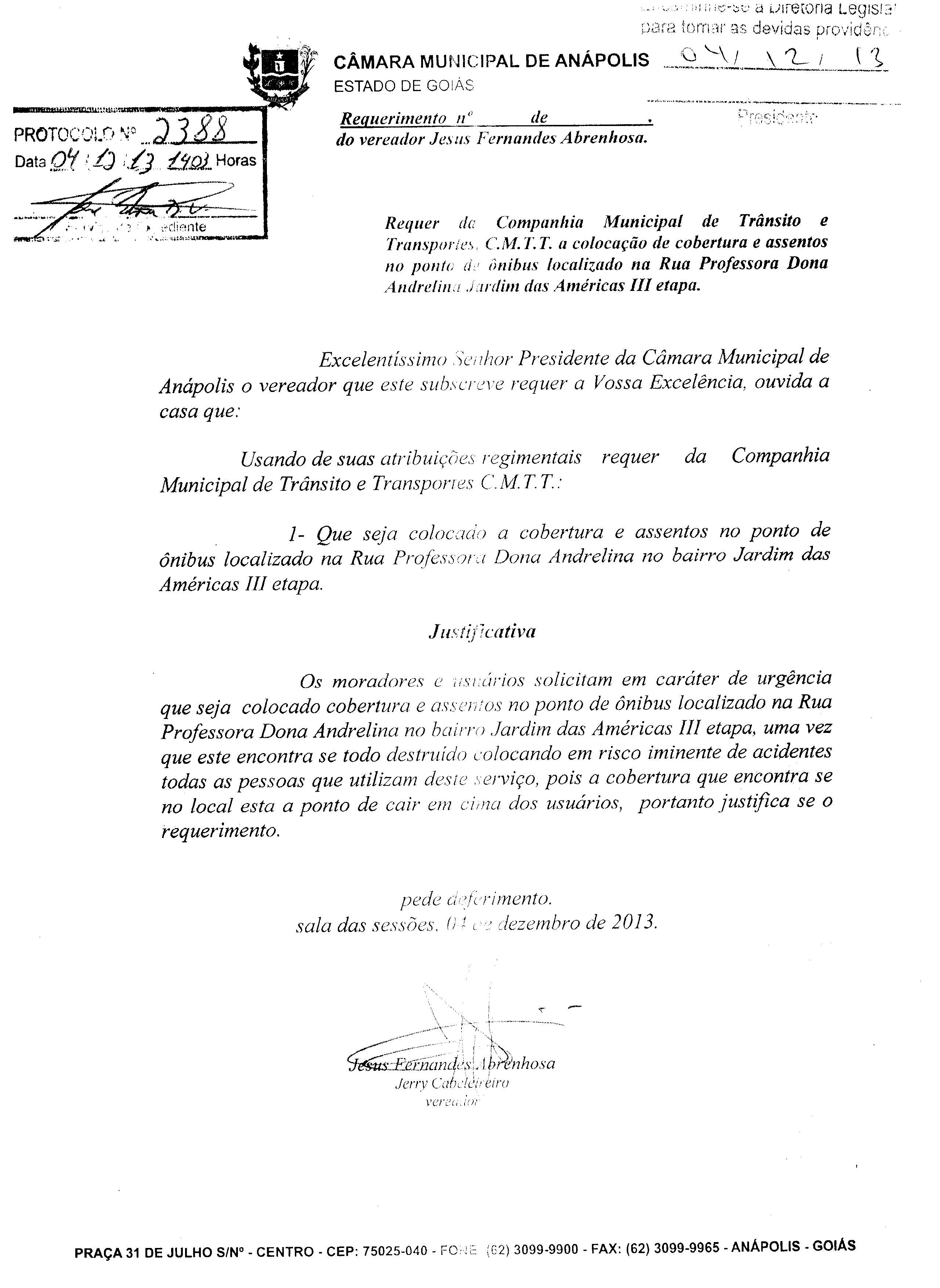 Ementa: À COMPANHIA MUNICIPAL DE TRÂNSITO E TRANSPORTE C.M.T.T., SOLICITANDO QUE SEJA COLOCADO A COBERTURA E ASSENTOS NO PONTO DE ÔNIBUS LOCALIZADO NA RUA PROFESSORA DONA ANDRELINA NO BAIRRO JARDIM DAS AMÉRICAS III ETAPA.