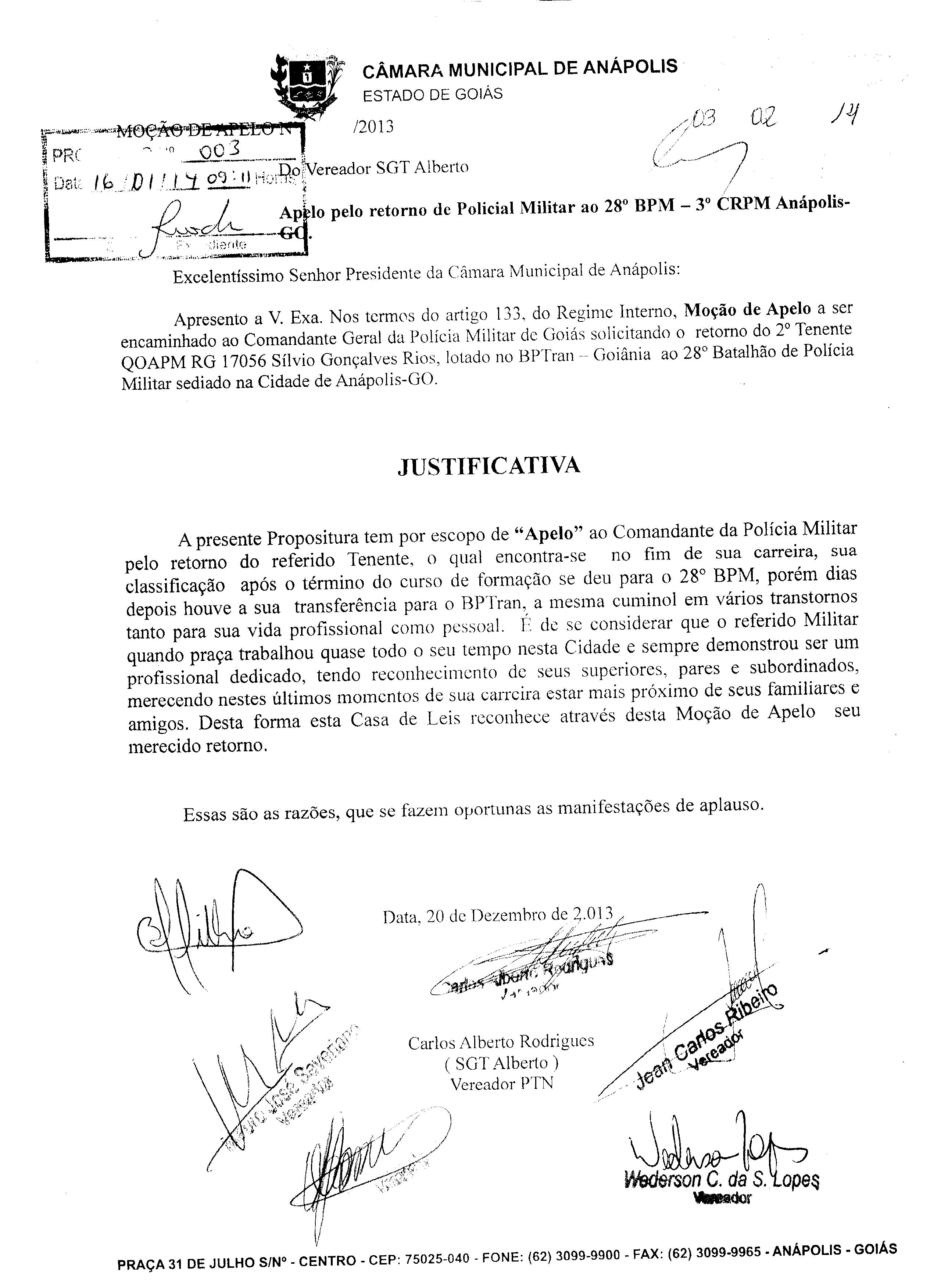 Ementa: MOÇÃO DE APELO A SER ENCAMINHADO AO COMANDANTE GERAL DA POLÍCIA MILITAR DE GOIÁS SOLICITANDO O RETORNO DO 2° TENENTE QOAPM RG 17056 SÍLVIO GONÇALVES RIOS, LOTADO NO BPTRAN- GOIÂNIA AO 28° BATALHÃO DE POLÍCIA MILITAR SEDIADO NA CIDADE DE ANÁPOLIS-GO.