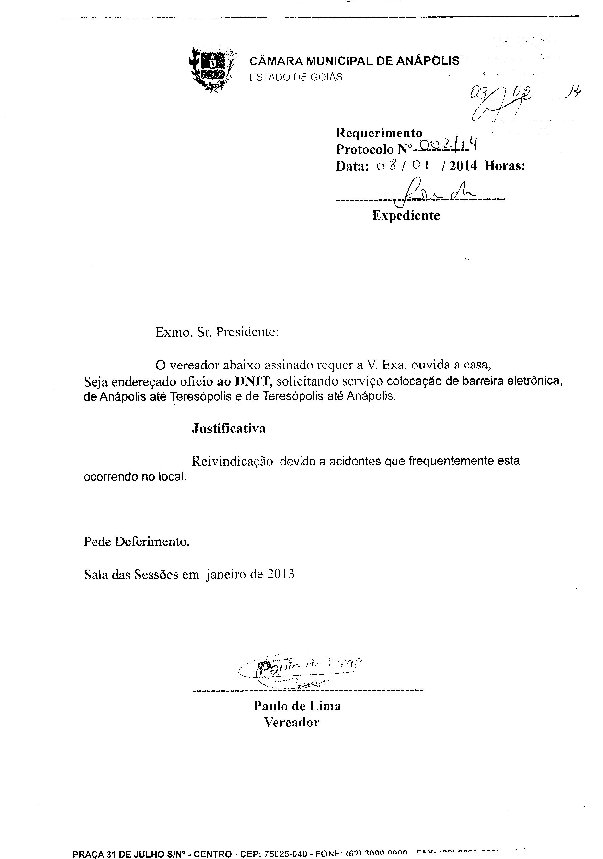 Ementa: AO DNIT, SOLICITANDO SERVIÇO COLOCAÇÃO DE BARREIRA ELETRÔNICA, DE ANÁPOLIS ATÉ TERESÓPOLIS E DE TERESÓPOLIS ATÉ ANÁPOLIS.
