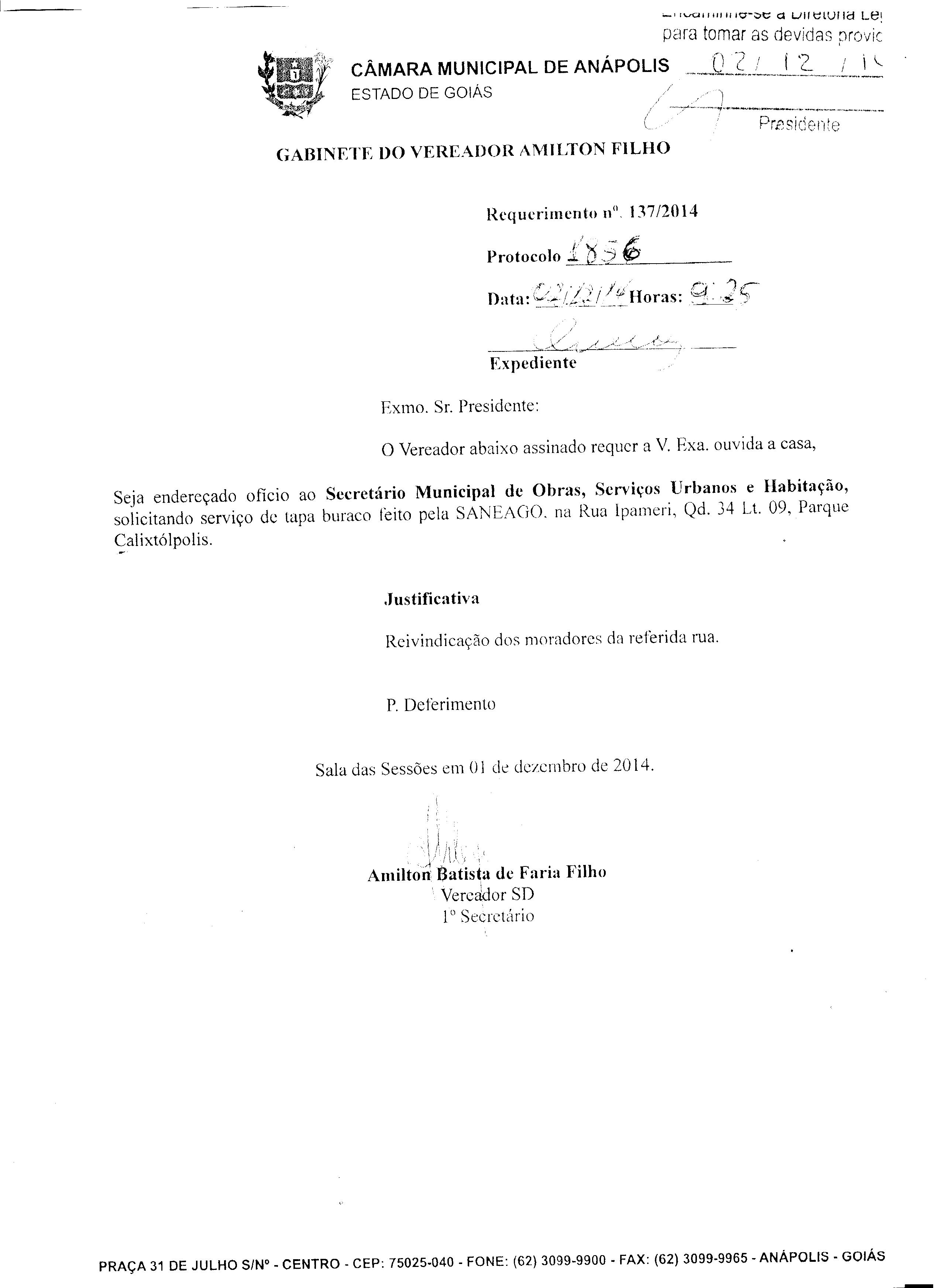 Ementa: SEJA ENVIADO OFÍCIO AO SECRETÁRIO MUNICIPAL DE OBRAS, SERVIÇOS URBANOS E HABITAÇÃO, SOLICITANDO SERVIÇO DE TAPA BURACO FEITO PELA SANEAGO, NA RUA IPAMERI, QUADRA 34 LOTE 09, PARQUE CALIXTÓPOLIS.