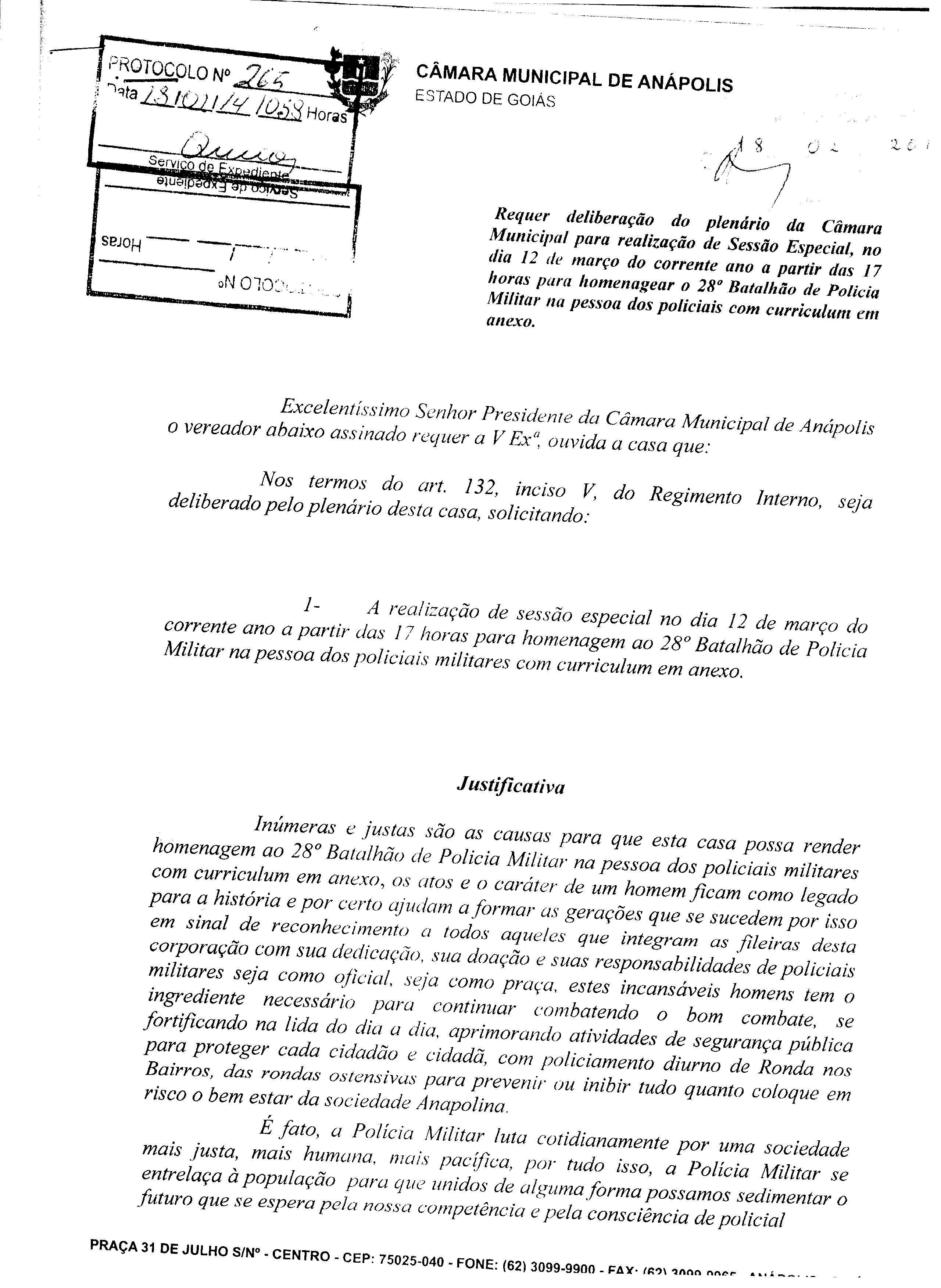 Ementa: QUE SEJA DELIBERADO PELO PLENÁRIO DESTA CASA, SOLICITANDO: A REALIZAÇÃO DE SESSÃO ESPECIAL NO DIA 12 DE MARÇO DO CORRENTE ANO A PARTIR DAS 17 HORAS PARA HOMENAGEAR AO 28° BATALHÃO DE POLICIA MILITAR NA PESSOA DOS POLICIAIS MILITARES COM CURRICULUM EM ANEXO.